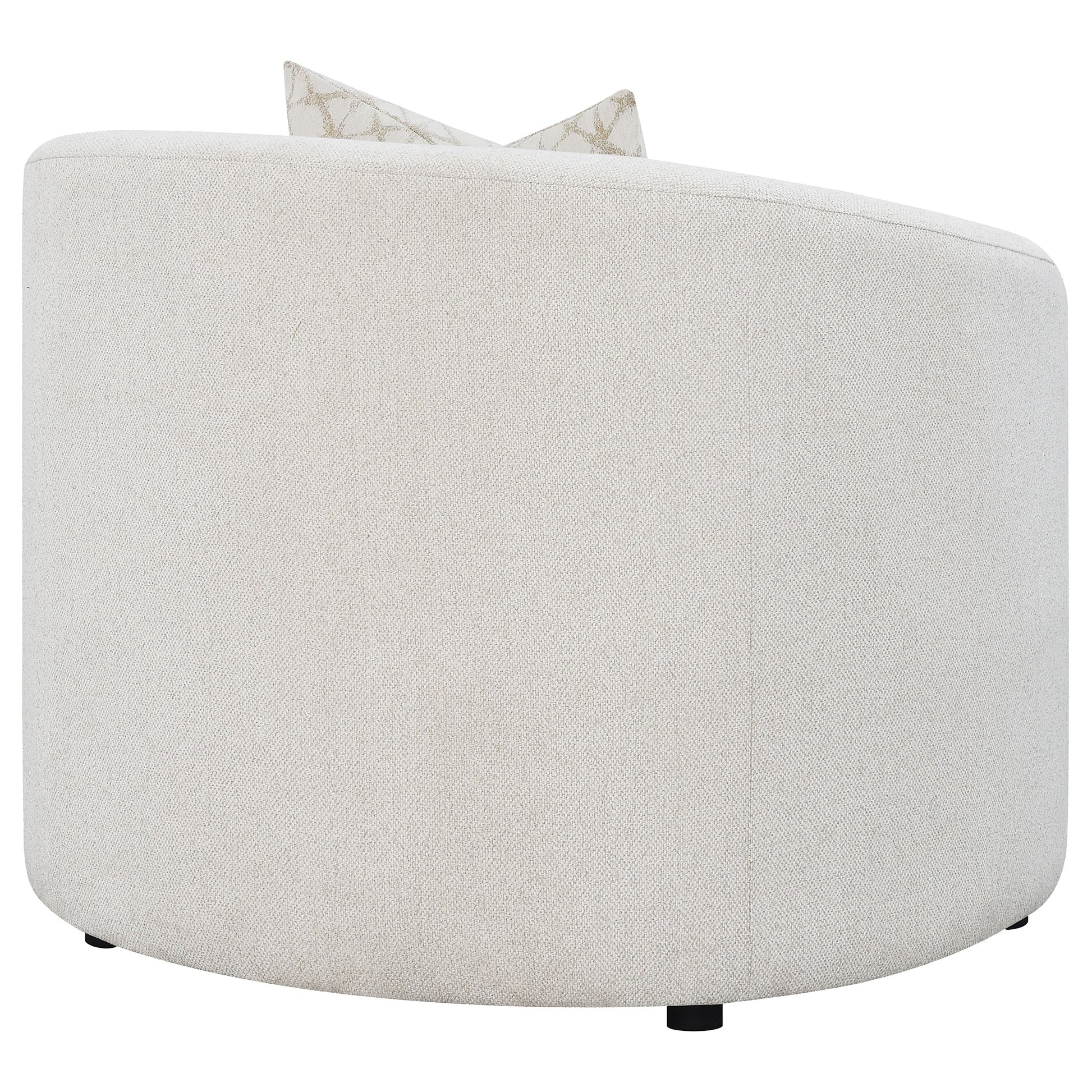 Elevate your contemporary living room reading nook with this elegant contemporary lounge chair, upholstered in a neutral latte finished boucle fabric throughout its contoured silhouette and curved sloped armrests. Accented by a single throw pillow, this sophisticated lounge chair presents a plush cushion and tailored backrest for a charming mid-century modern flair.