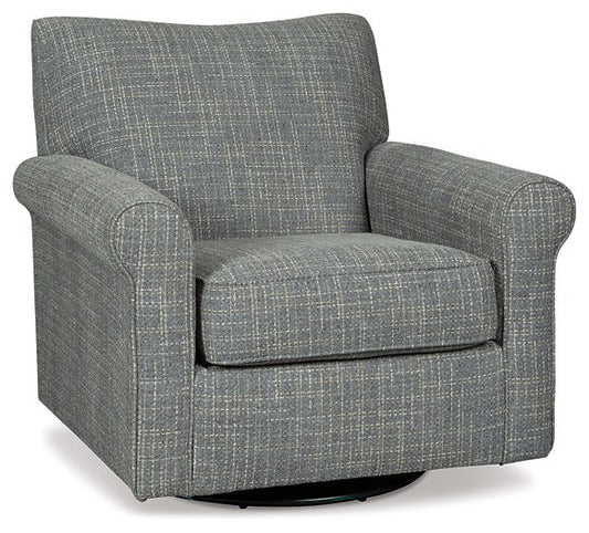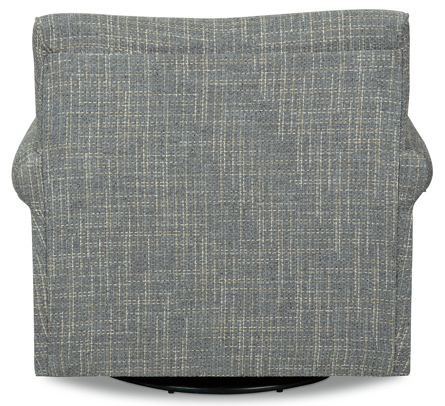 Sporting a tantalizing tweed weave fabric in such a soothing blue hue, this swivel glider accent chair gives the classic roll arm chair a modern twist. Smooth, 360-degree swivel caters to your comfort—and your viewing pleasure. Gentle glider feature is designed to rock your cares away.| Full Dimension | 36W x 37D x 36H |