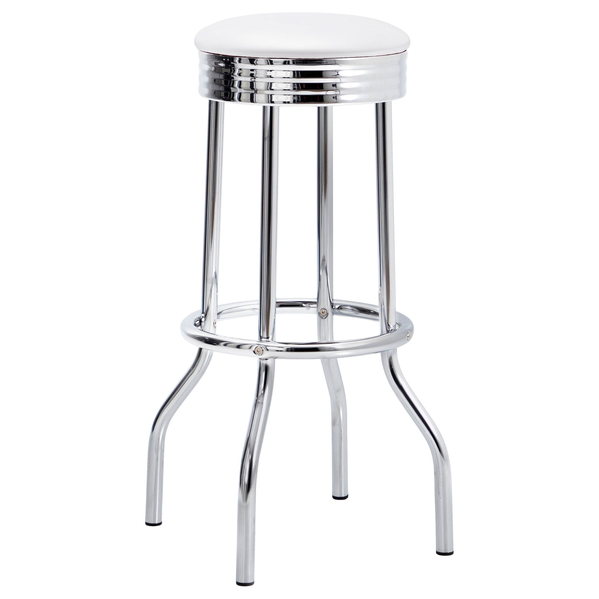 Step back in time with this exquisite 3-piece pub height bar table set, perfect for adding a touch of retro elegance to any space. The gleaming chrome base and laminate tabletop evoke the charm of a 1950s soda fountain, making every meal feel special. The set includes two matching backless swivel bar stools, upholstered in leatherette, bringing comfort and style to your gatherings. Whether you're enjoying a casual breakfast or an evening drink, this set transforms your space into a nostalgic yet sophisticated retreat. Embrace the perfect blend of past and present with this timeless ensemble.