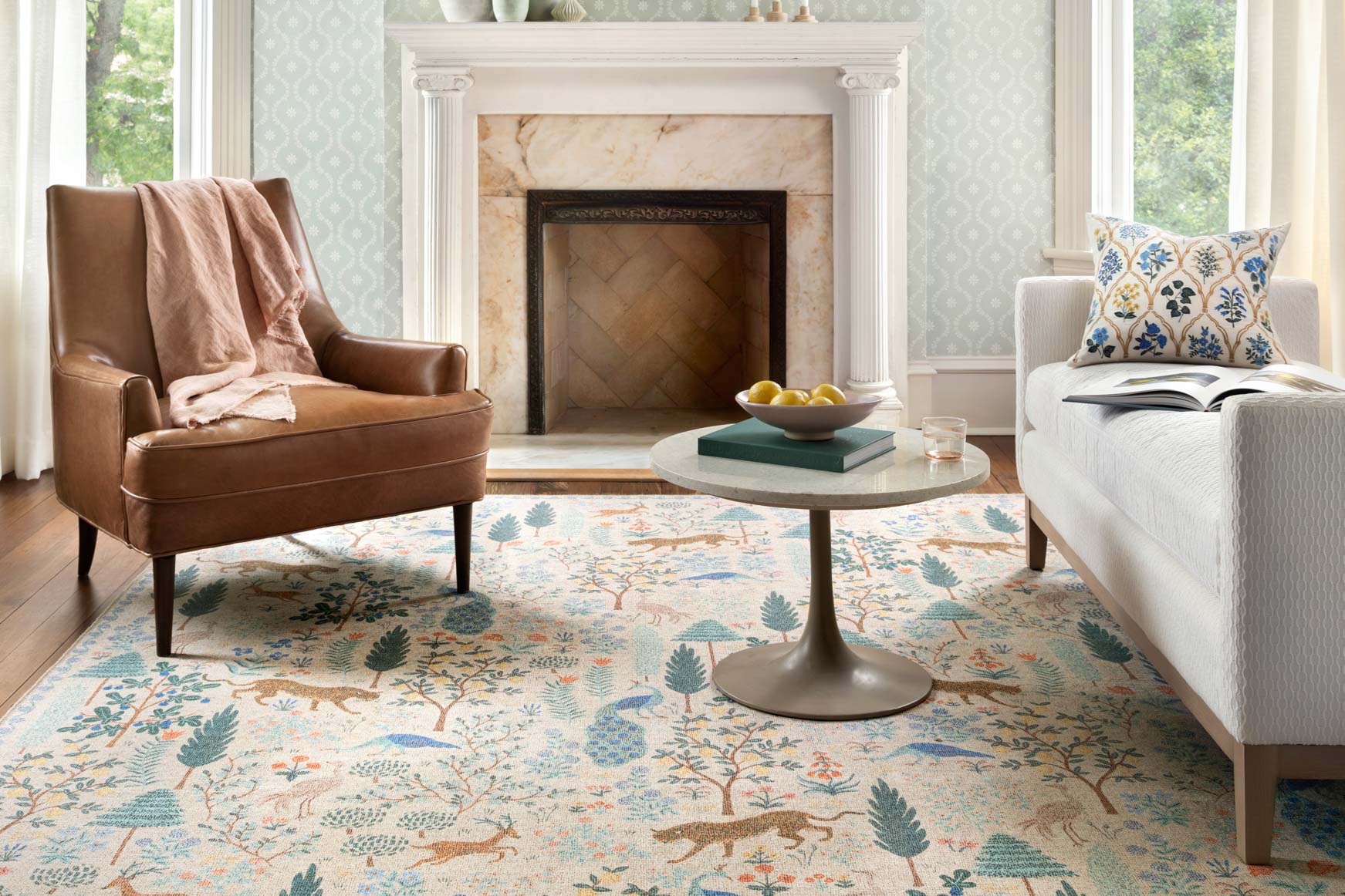 Power-loomed of 100% polyester pile in Turkey, the Menagerie Collection for Rifle Paper Co. x Loloi brings whimsy to the home. Featuring soft hues, thriving botanicals, and quiet forest creatures, Menagerie was designed to bring the iconic illustrations to life and built to withstand foot traffic.