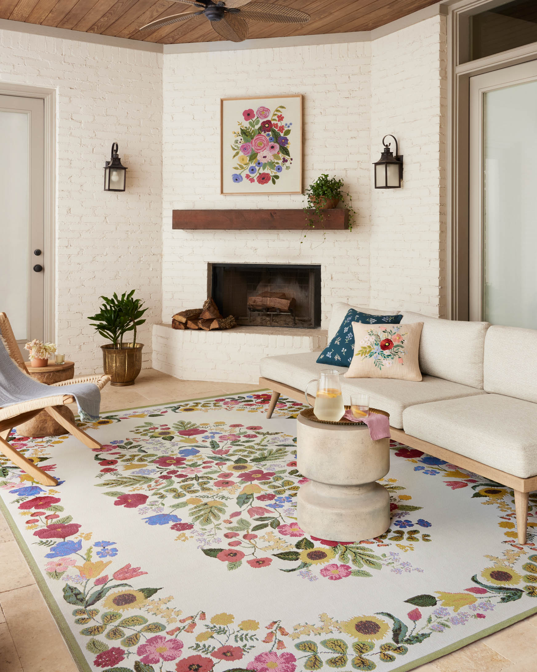 The Rifle Paper Co. x Loloi Perennial Collection features indoor/outdoor area rugs. Signature Rifle Paper Co. florals in bold, vibrant palettes make each rug a standout, whether it's styled indoors or out, on patios or in mudrooms, hallways, or playrooms. The rug is power loomed of polypropylene and polyester for durability and weather resistance, simply hose off and air-dry when needed. Made in Egypt. This collection is OEKO-TEX certified, ensuring its materials don't contain harmful substances.
