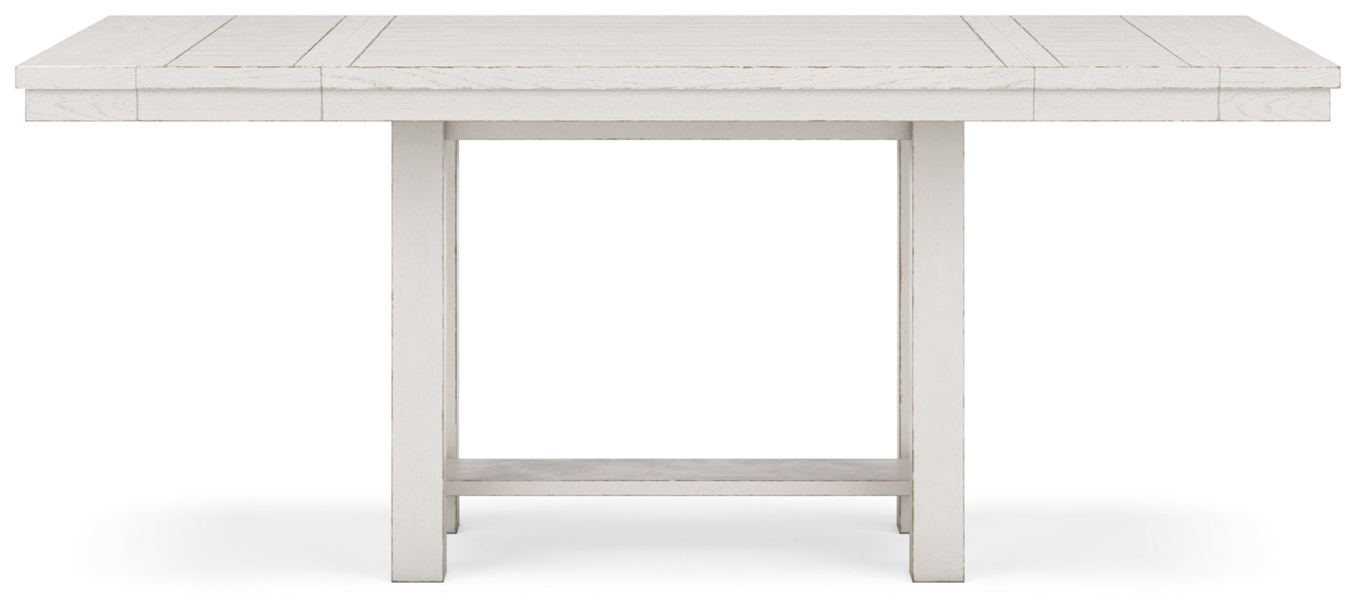 This dining package is sure to impress come mealtime. With its antiqued white finish, light gray upholstery and a planked effect tabletop that extends for additional seating, farmhouse-style seating has never been so fashionable. All thatÕs missing is you and your family.