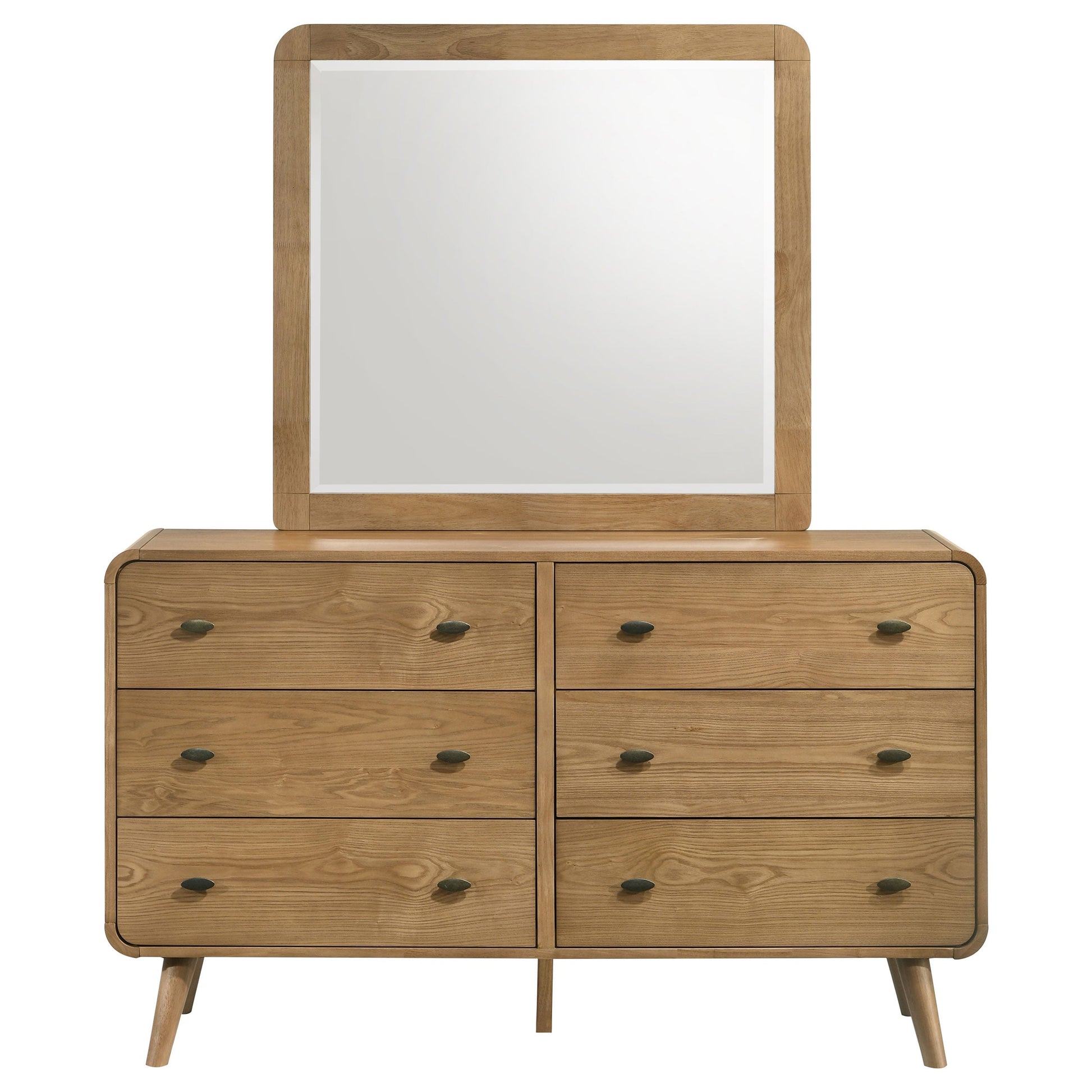 Achieve the perfect blend of style and functionality with this mid-century modern dresser and mirror set. The dresser, constructed with pine, engineered wood, and walnut veneer, features six spacious drawers with felt-lined top drawers for organizing wardrobe essentials. Rounded edges, tapered legs, and a clean silhouette highlight the retro-modern appeal of this timeless duo. The matching mirror completes the set with its sophisticated design and polished details.