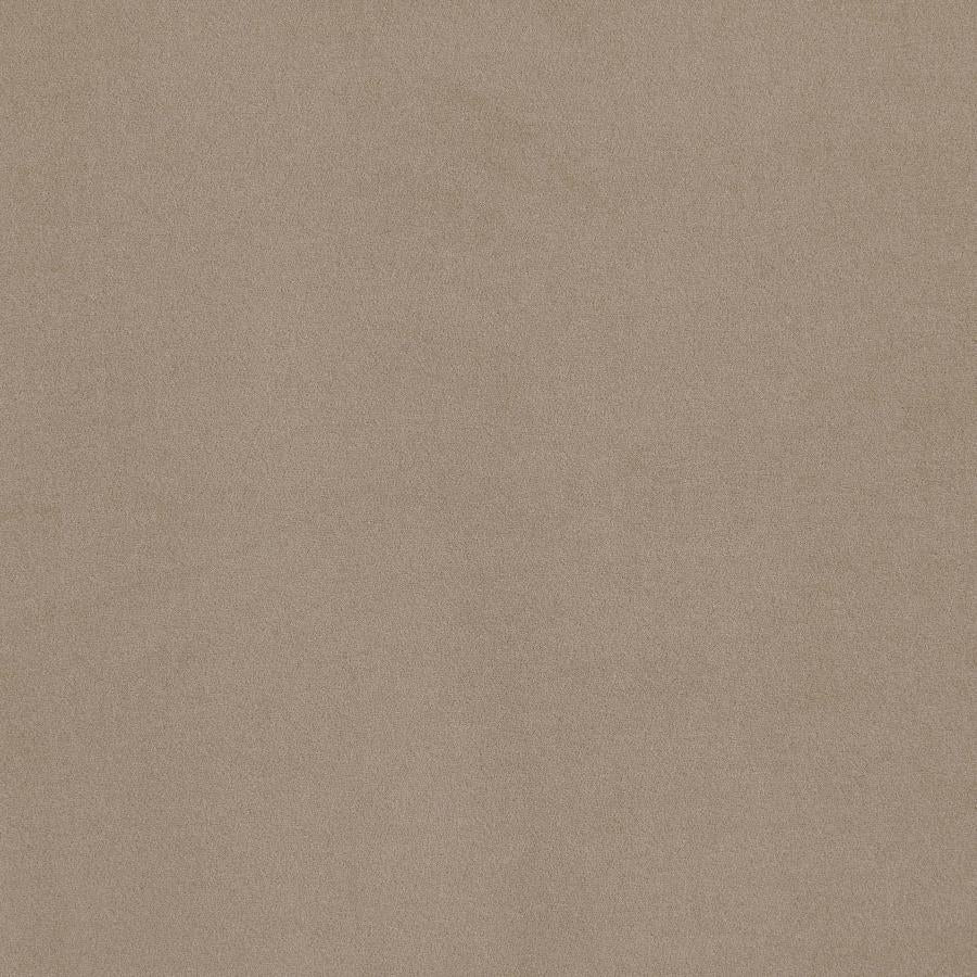 Elevate your living space with the Sandrine Sofa from Coaster (Model No. 509741). This modern-Chesterfield style piece features button-tufted backrest, velvet upholstery in a rich camel tone, rolled tuxedo arms with self-welt trim, and a sleek wood base and legs in greige finish. Designed for comfort and sophistication, it offers an elegant profile that complements transitional and contemporary décor.
