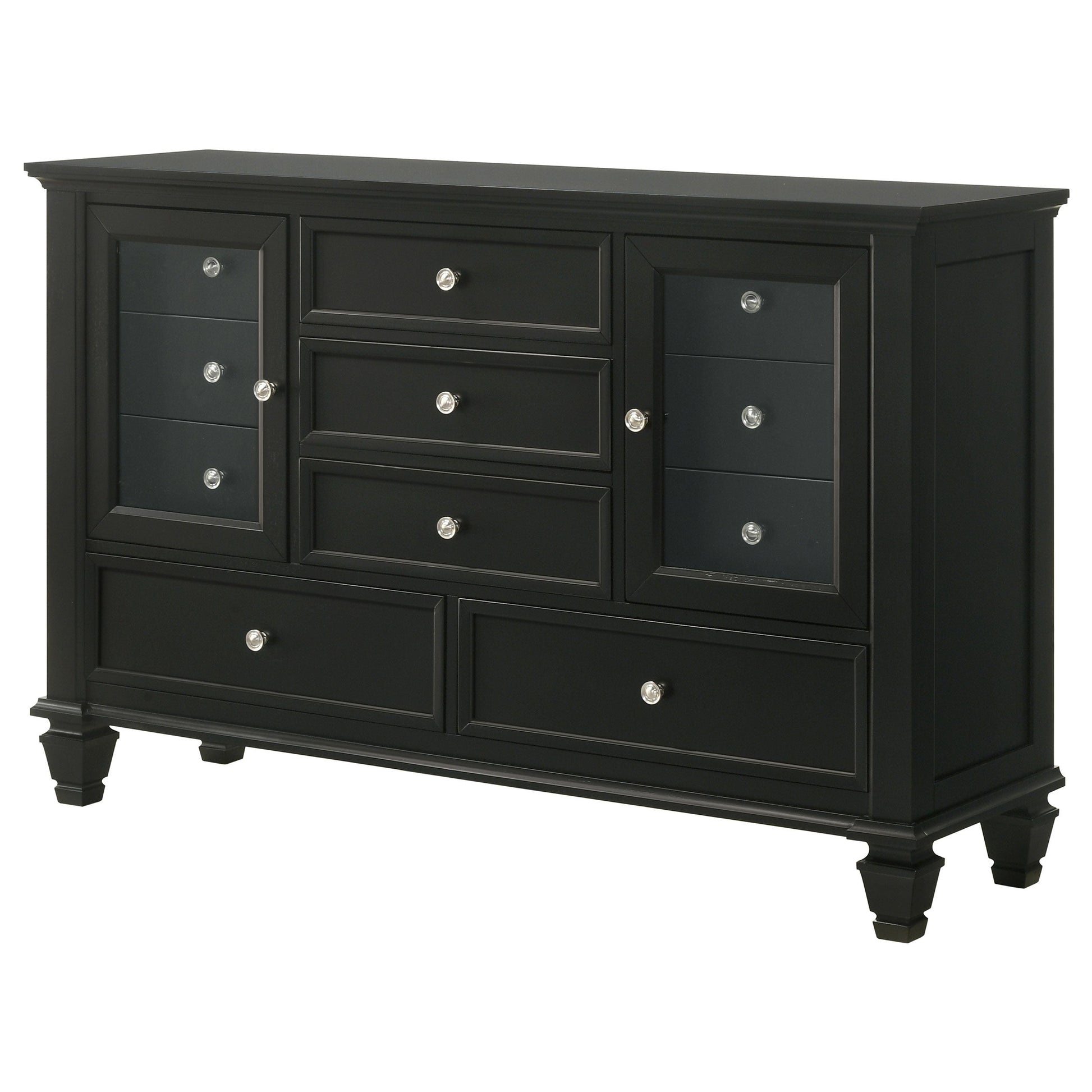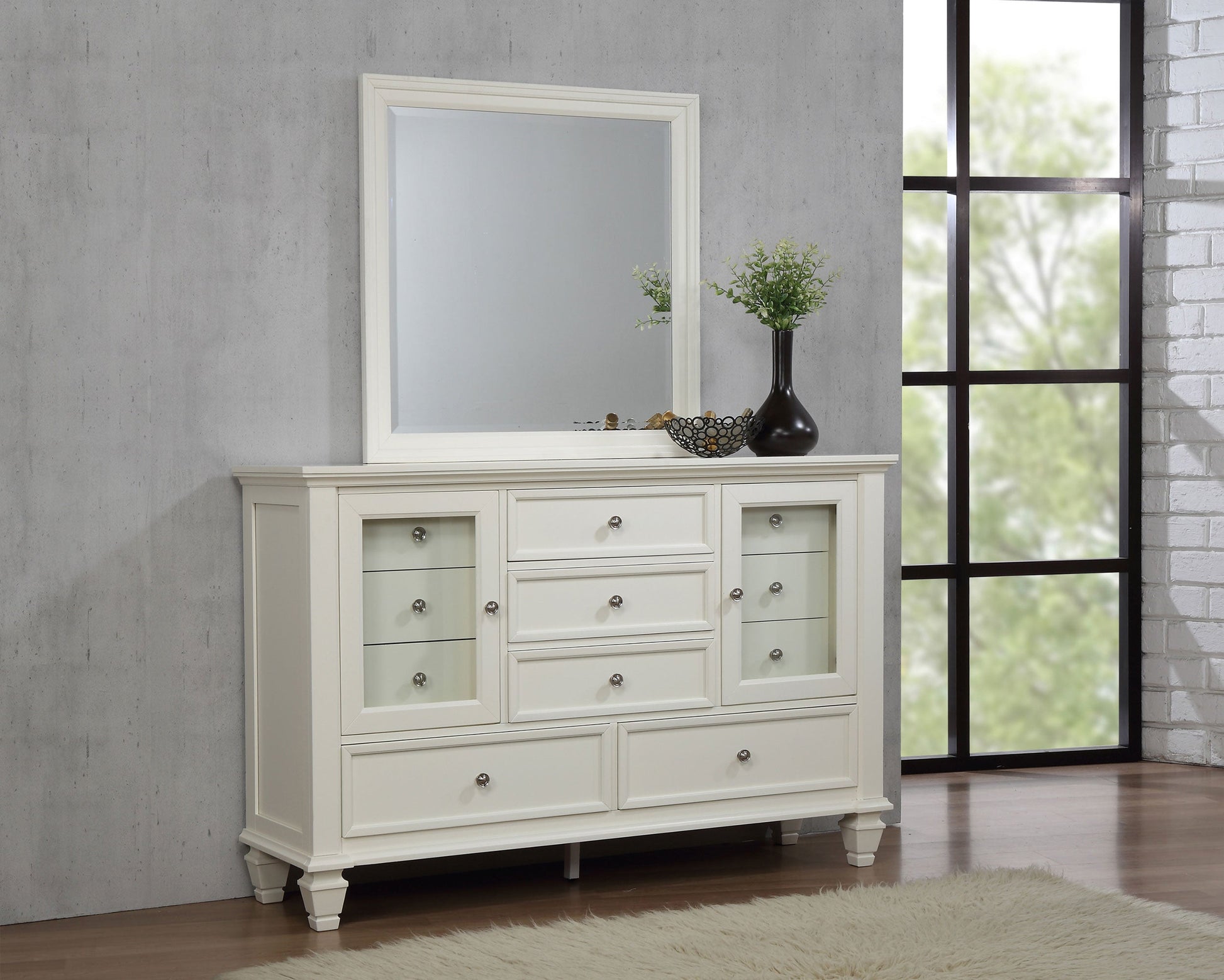 Bring both elegance and ample storage to your bedroom with this beautifully crafted dresser, featuring 11 spacious drawers and two wood-framed tempered glass doors. The mix of drawers and glass-paneled cabinets offers a perfect blend of functionality and display options. Felt-lined top drawers provide a safe space for delicate items, while the English dovetail joints and metal extension glides ensure smooth and durable drawer operation. The two wood-framed tempered glass doors reveal additional shelving for showcasing your favorite decor or accessories. Constructed from solid hardwood and engineered wood, this dresser boasts durability and timeless appeal. Finished in a neutral color with brushed nickel hardware, it adds a refined touch to any bedroom setting.