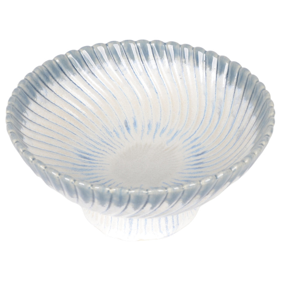 The Sarvan Bowl blends artisanal texture with modern elegance. Featuring a footed base and gently elevated rim, this decorative ceramic bowl showcases a vertical ribbed design with a soft, two-toned glaze—creamy white below and streaked light blue-gray above. Its handcrafted look adds a refined coastal or contemporary touch to any space.