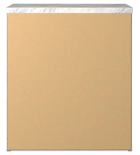 Cool, clean and casually modern. This nightstand’s light natural finish and faux Calcutta marble top set the tone for your calming sanctuary. Large linear pulls add dimension and authenticity. Two smooth-gliding drawers neatly accommodate your bedside needs.| Full Dimension | 22W x 16D x 25H |