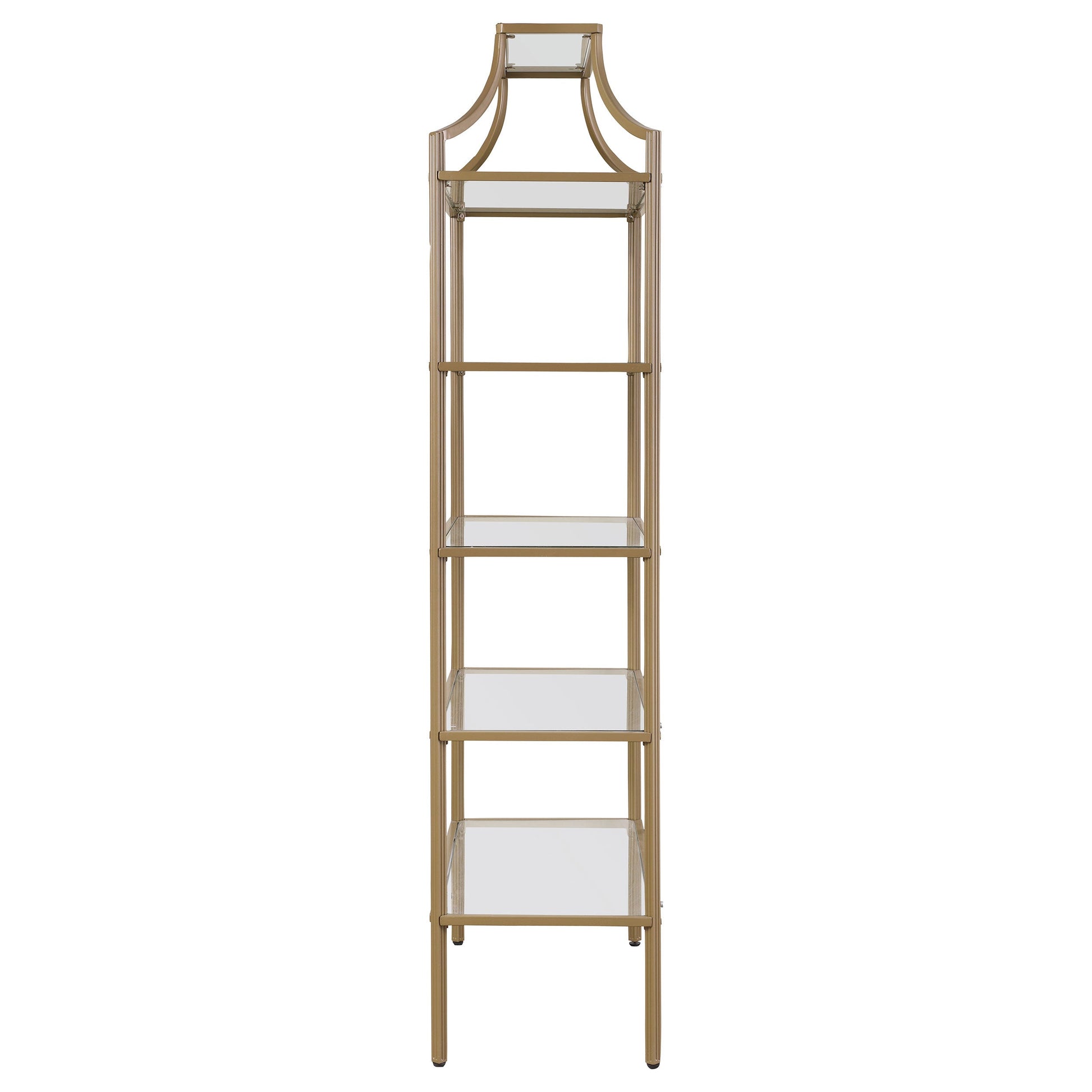 A call for strength and style gets answered by this bookcase. Contemporary style allows for easy placement within your space. The stylish metal frame in gold creates conversation. Enjoy durability as all glass elements are tempered. Updated unit boasts five (5) open shelves for use as storage or display.