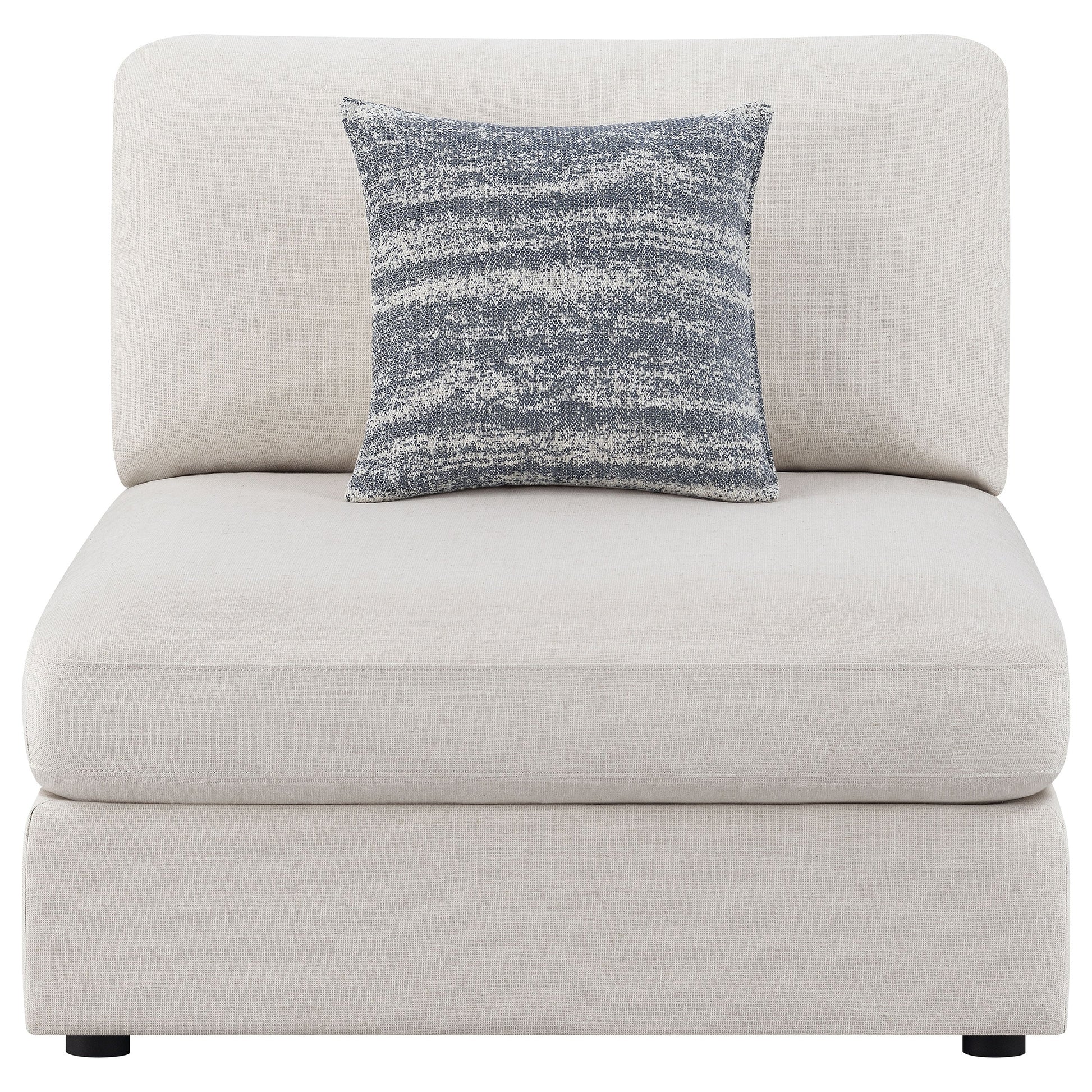 Create your own modular home setup with this plush, armless chair. It entices you to sink into its deep, comfortable cushions. The chair can function alone, as well as part of a larger sectional sofa. The simple lines of the piece add up to a comfy, easy-to-use element in any decor. Linen adds a natural textural accent.