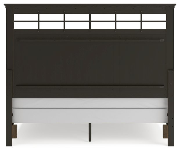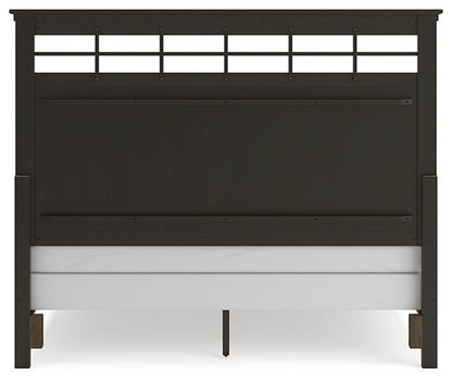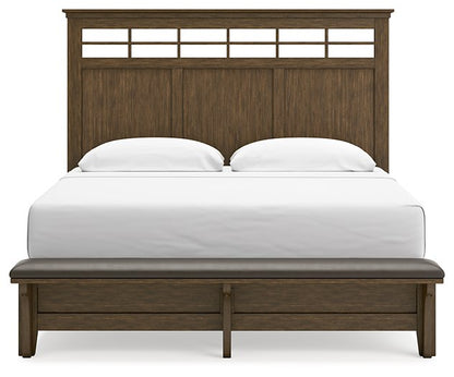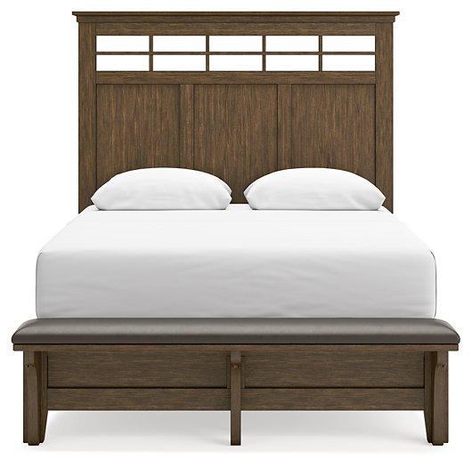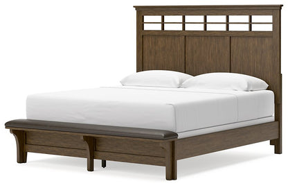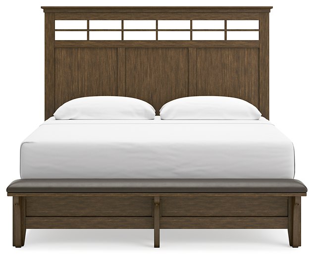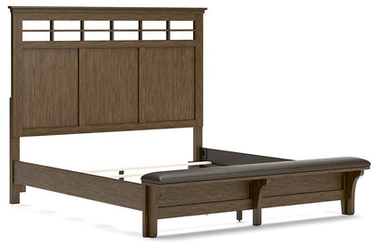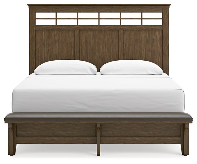 This king panel bed is well-suited to everyday living with its expertly balanced approach to style and function. Take the stress out of decorating—a classic medium brown finish easily pairs with existing furniture pieces. Its timeless design stays in style as you update your space, while open detailing at the top of the headboard is a trendy touch. And its cushioned footboard bench provides seating for morning get-ready routines or late night chats. All that's left for you to do is to effortlessly enjoy the day-to-day comforts of home.| Full Dimension | 81.5W x 93.5D x 67.25H |