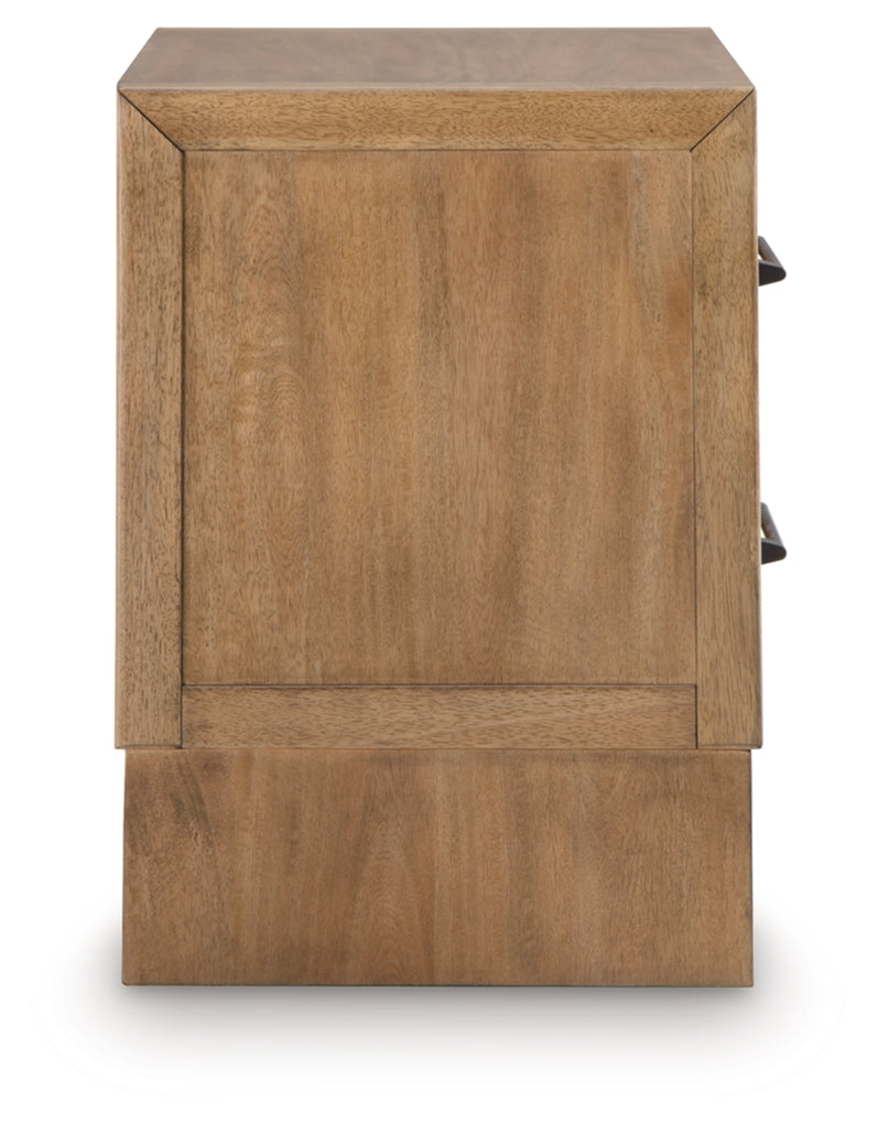 If you appreciate minimalistic style, this nightstand is the ideal option. Its soft and simple finish has a laid-back sensibility, blending relaxed contemporary design with a trendy allure. The spacious drawers are accented with stylish metal drawer pulls in a darkened bronze tone. What a delightful addition to your casual-chic decor.