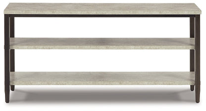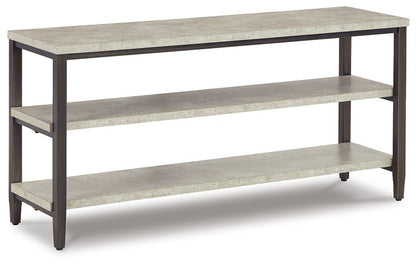 With its casual, linear style design, this spacious sofa table works wonderfully well with larger sofas and sectionals. You'll easily make use of the handy open storage that the two shelves have to offer. Features faux concrete melamine top with metal base in a aged bronze-tone finish.| Full Dimension | 48W x 14D x 23H |