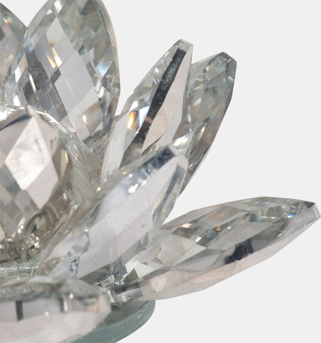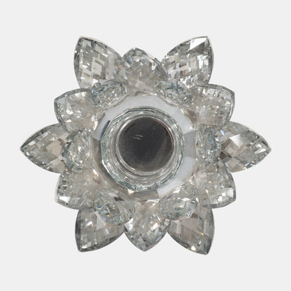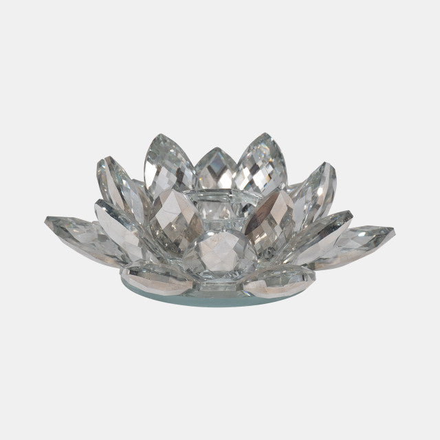 Get your space ready for its glow-up! This gorgeous glass votive candle holder is created out of high quality crystal for an attractive look that is durable. Not only does it serve the purpose of providing a place for your favorite votive candles and tealights to shine, it creates a stunning piece of decor for any space. This candle holder features a beautiful lotus flower in silver for an eye-catching look. Add to any coffee table, mantle, shelf, counter or desk in your home or office, or elevate your wedding or other formal event to the next level!