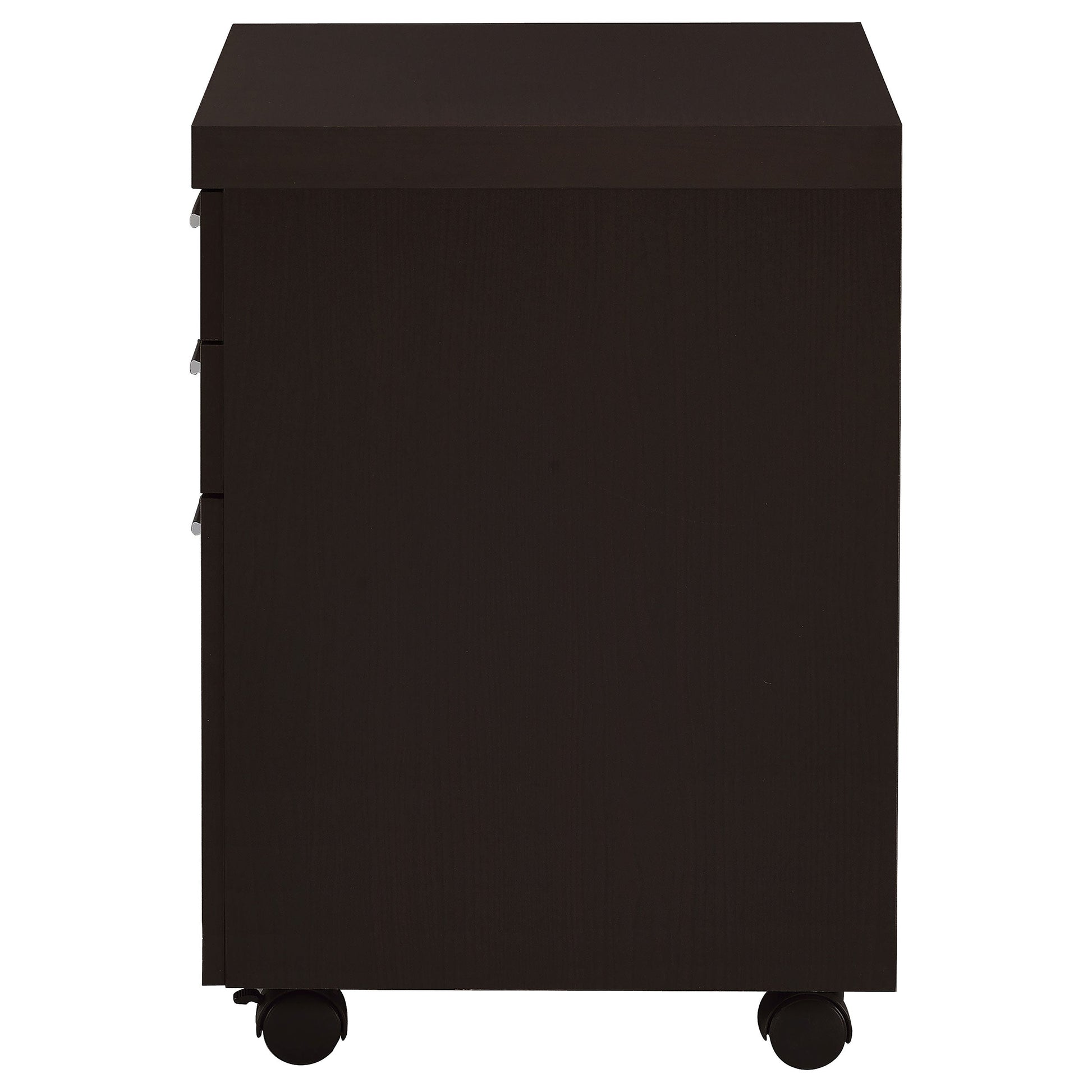 Organize files in style. This mobile file cabinet offers plenty of room to store documents in a desk configuration. With a gorgeous cappuccino finish, it brings a stylish look to a home or business office. Silver hardware pads its modern appeal. Built-in casters and a storage drawer expand the functionality of this mobile file cabinet.