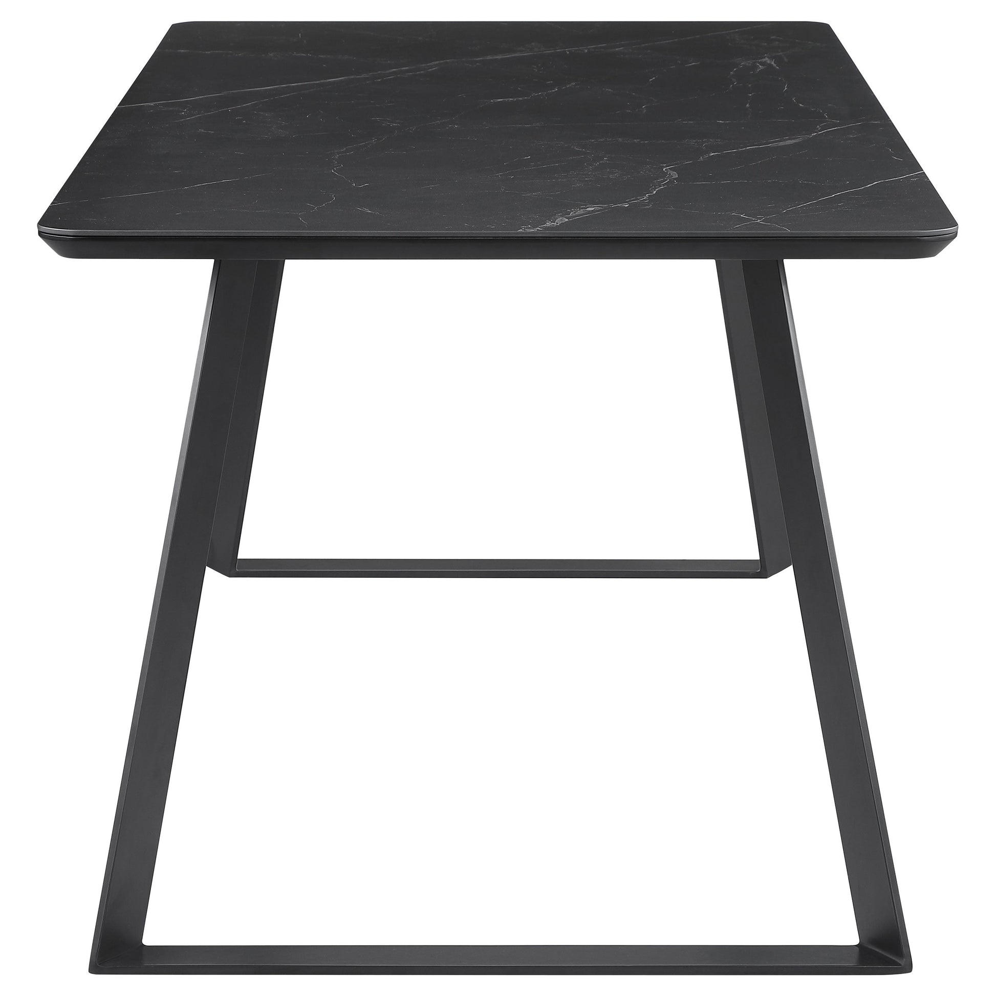 Transform your dining room into a sleek interior with this modern dining table. A bold, matte gunmetal finish defines the hard edges and clean lines of this stellar mid-century modern-inspired dining table. A spacious rectangular top with a rounded bevel edge presents ample seating for six guests. Sled style legs flare outward, creating a dramatic expression. A black China ceramic tabletop with softly rounded corners features an elegant white striation throughout for a classically designed marble-like appearance.