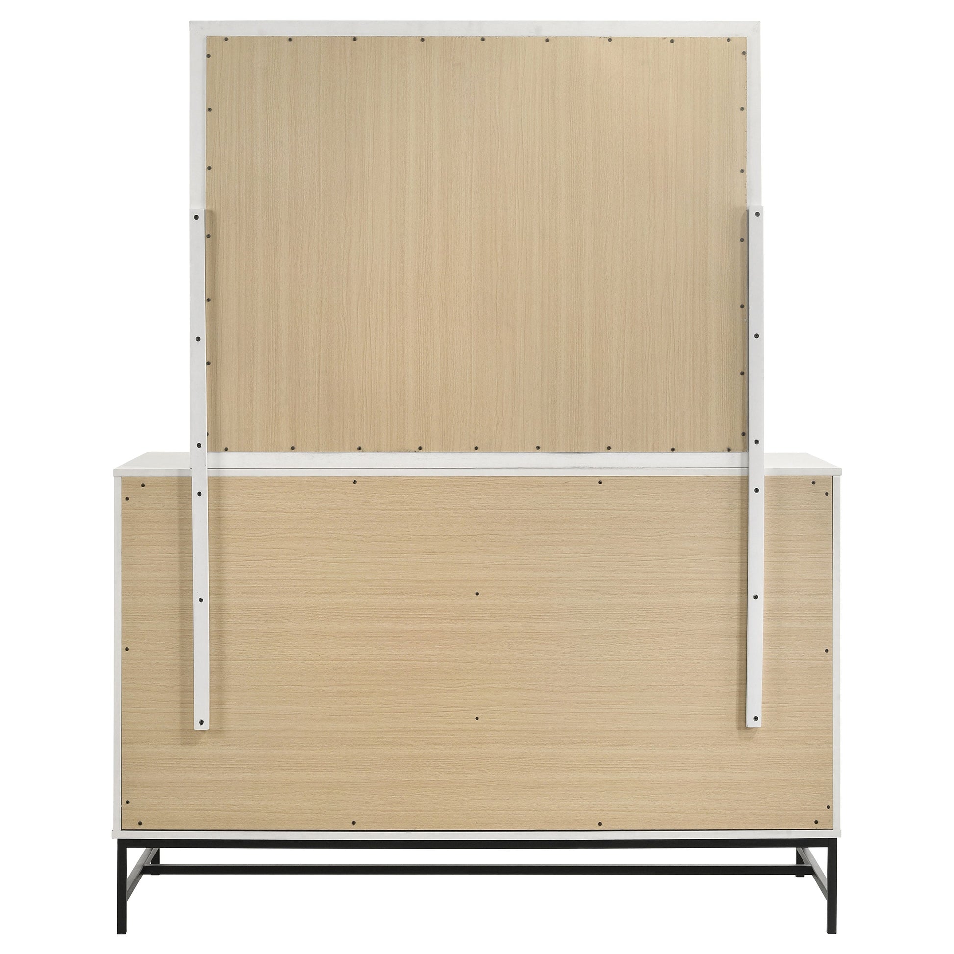 Fresh white brings bright, contemporary appeal to a modern six-drawer dresser. Perfect for a refined or casual bedroom space, it features a melamine finish that's durable and resistant to damage, great everywhere from master suite to a kid's bedroom. Each drawer features a long black finish bar pull that adds contrast. A matching black metal base elevates the dresser and creates an airy finishing touch. Use the top for decor that adds a personal touch to your bedroom.