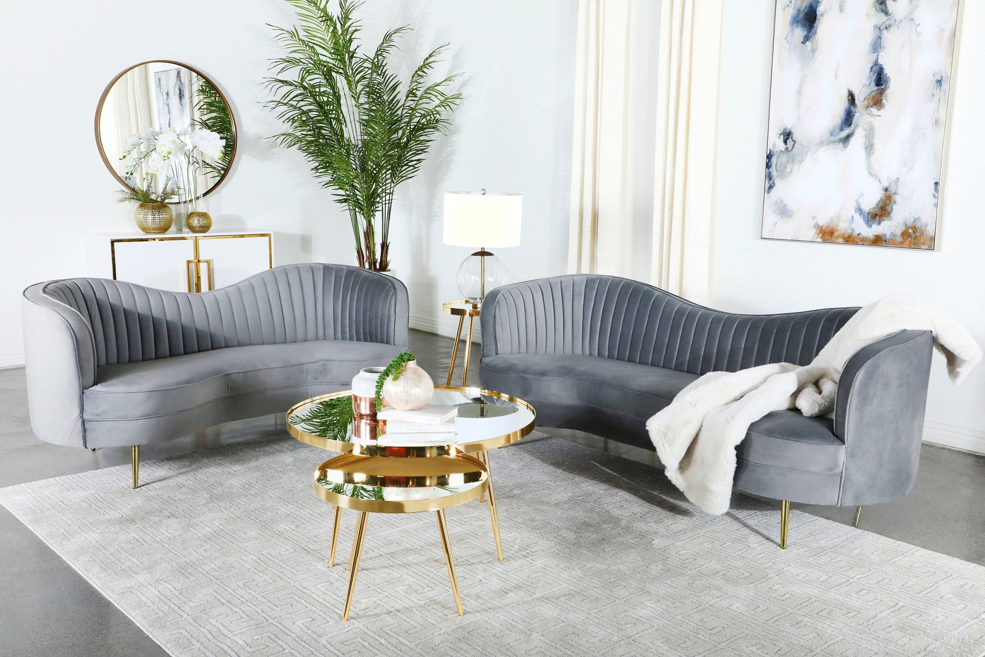 Art Deco never looked so dramatic! This retro-inspired seating set features a vivid deep blue velvet upholstery throughout, complementing by mid century modern style tapered legs in a warm gold hue. Extra details such as channel tufted interior and a vintage kidney-shaped silhouette truly make this seating ensemble one of a kind. A twist on the iconic tuxedo style, this seating group has sleek, slim track arms and an inverted camelback backrest that flows into one another. Boasting a regal aesthetic, each furniture piece offers to be a centerpiece.