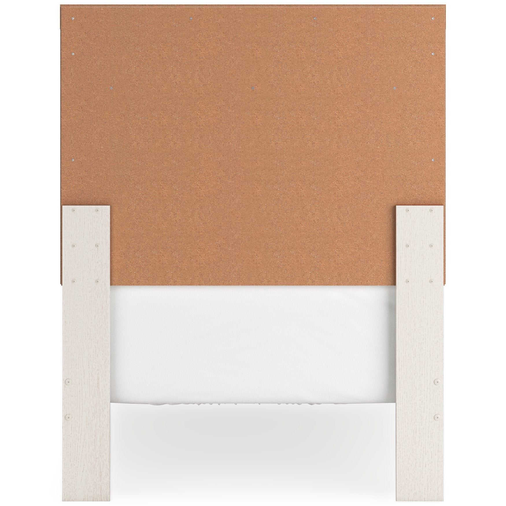 With its clean-lined look and modern attitude, this full panel bed is a fresh style awakening. A crisp, white hue over subtle replicated wood grain easily complements other furniture finishes. The simple, unadorned profile is given depth and dimension with the addition of plank-style moulding on the headboard—proof that beauty lies in the details.| Full Dimension | 57W x 78D x 53H |