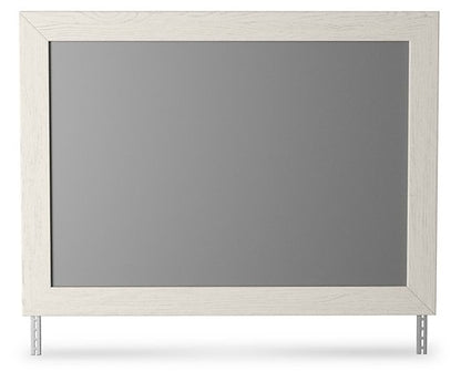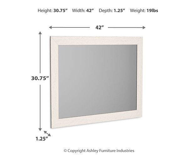 With its clean-lined look and modern attitude, this mirror is a fresh style awakening. A crisp, white hue over subtle replicated wood grain easily complements other furniture finishes. Whether hung vertically or horizontally, this alluring mirror is on the cutting edge of cool.| Full Dimension | 42W x 2D x 31H |