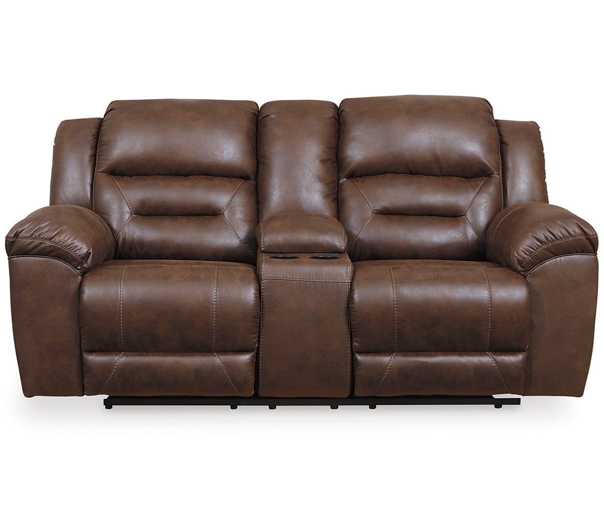 For those who love the cool look of leather but long for the warm feel of fabric, this power reclining loveseat delivers both with ease. Its high-performance padded faux leather is remarkably durable and easy to clean, making it just the thing for family spaces. When itÕs time to relax, the one-touch power control puts the perfect position at your fingertips. Channel-stitched back cushions provide indulgent lumbar support for maximum seating comfortÑnot to mention fashion-forward flair.