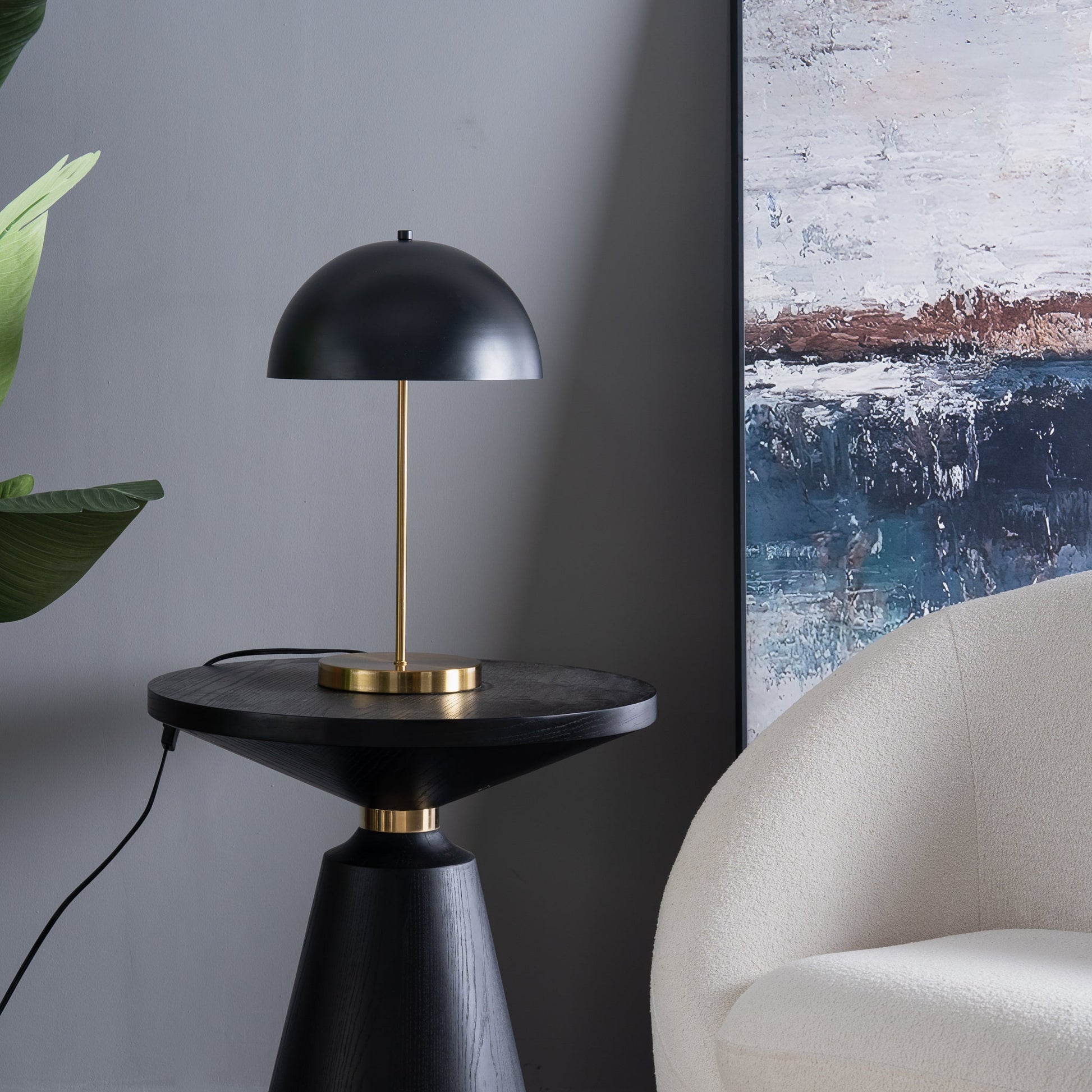 Enhance your home with this stylish table lamp featuring a sleek black dome shade with a clean white interior. The gold metal base provides a striking contrast and ensures durability, making it a perfect addition to your decor. Designed with an in-line switch for easy operation, this table lamp adds elegance and functionality to any living space, bedroom, or office.