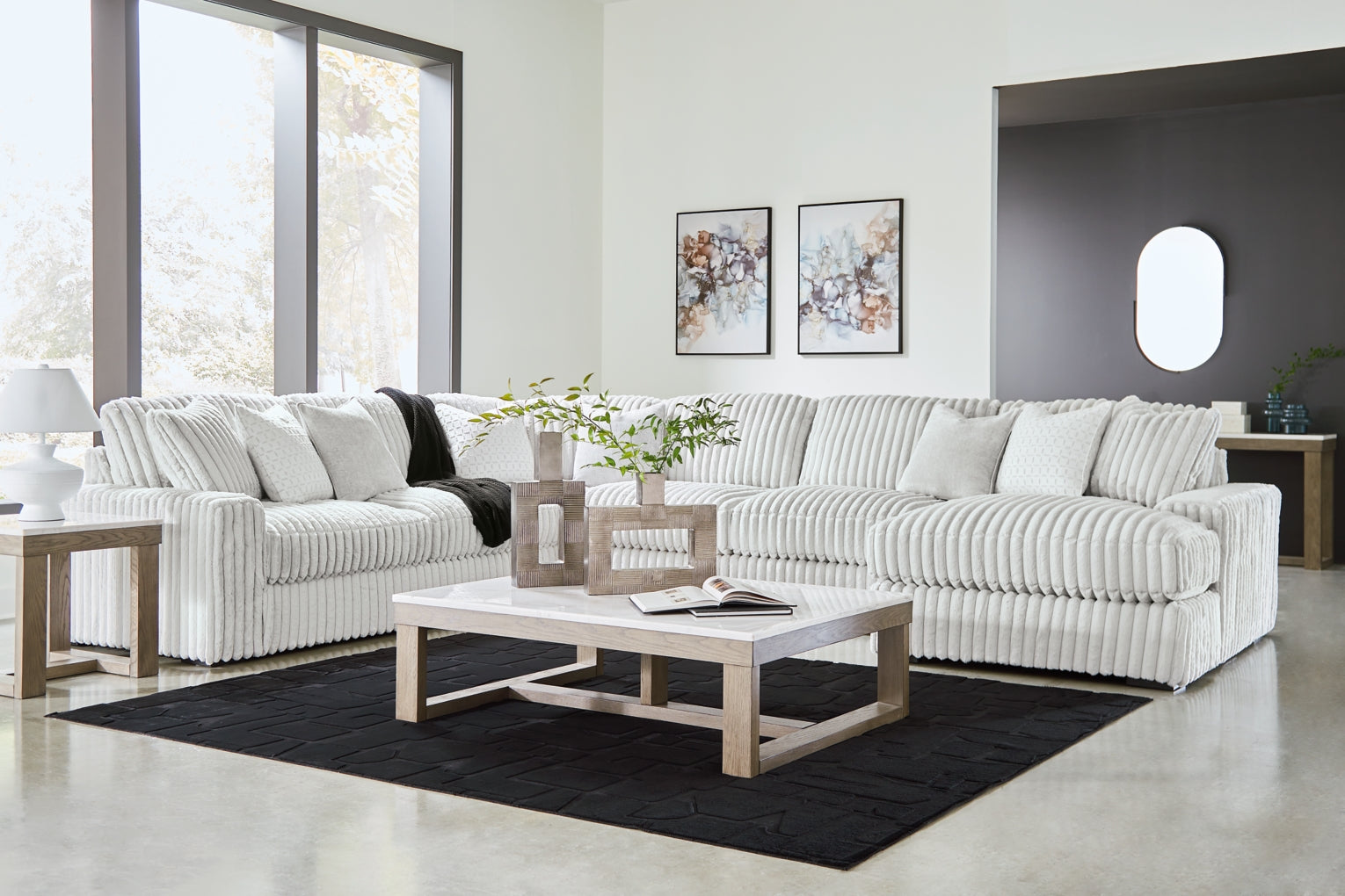 DonÕt want to sacrifice standout style for majorly cozy seating? This sectional with chaise pairs bold character with sink-in comfort. Its retro-cool jumbo cord over feather-blend cushions creates a luxuriously soft lounging experience. With this sectional, you can balance everyday relaxation and your unique eye for design.