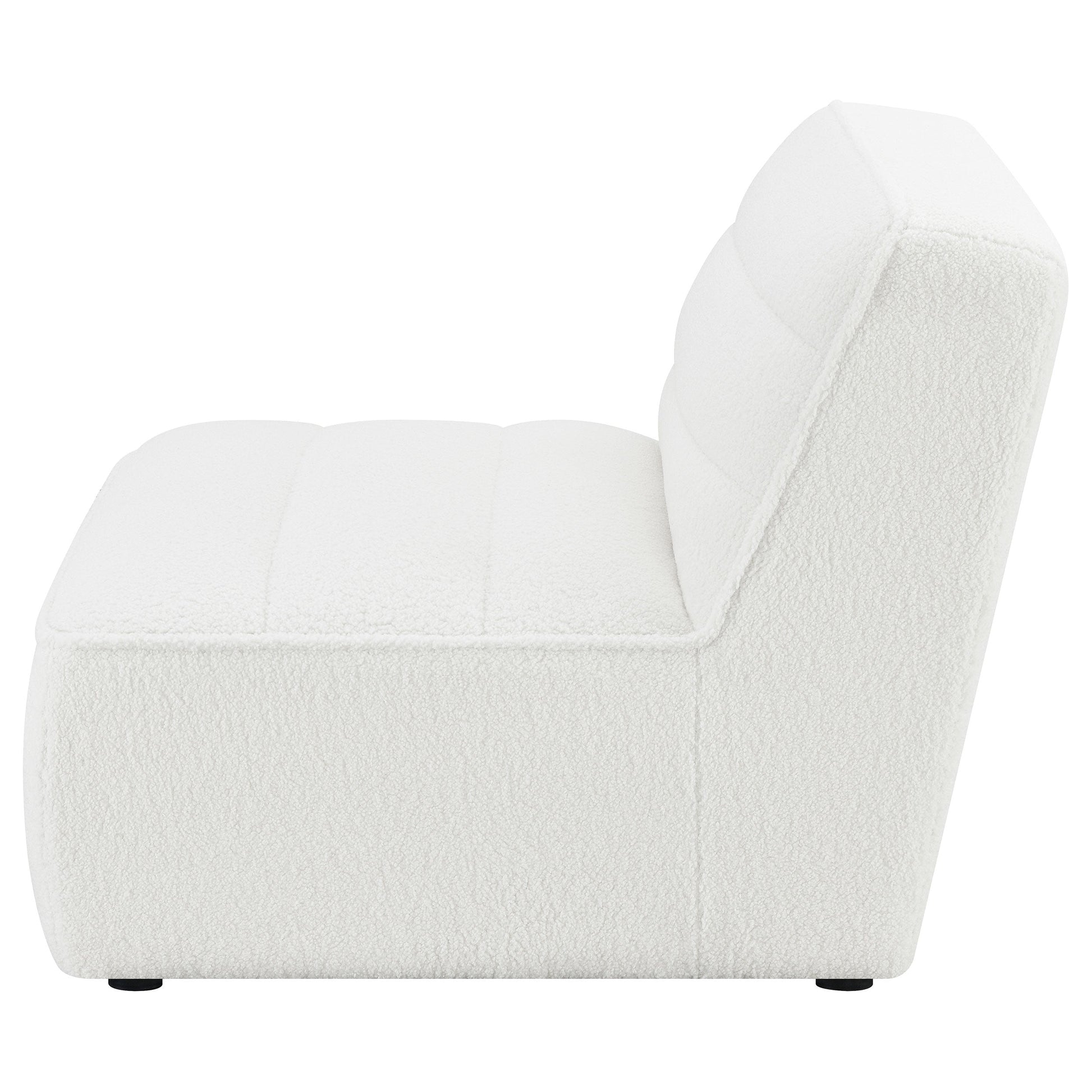 This modular armless chair offers the perfect combination of comfort and versatility. The plush, deep cushioning ensures long-lasting support while the channel-tufted backrest adds a touch of refinement to any space. Whether you use it as a standalone piece or as part of a larger sectional, its modern design complements a wide variety of interiors. Designed for flexibility, this chair can be seamlessly integrated into various room layouts, making it a practical addition to any home.