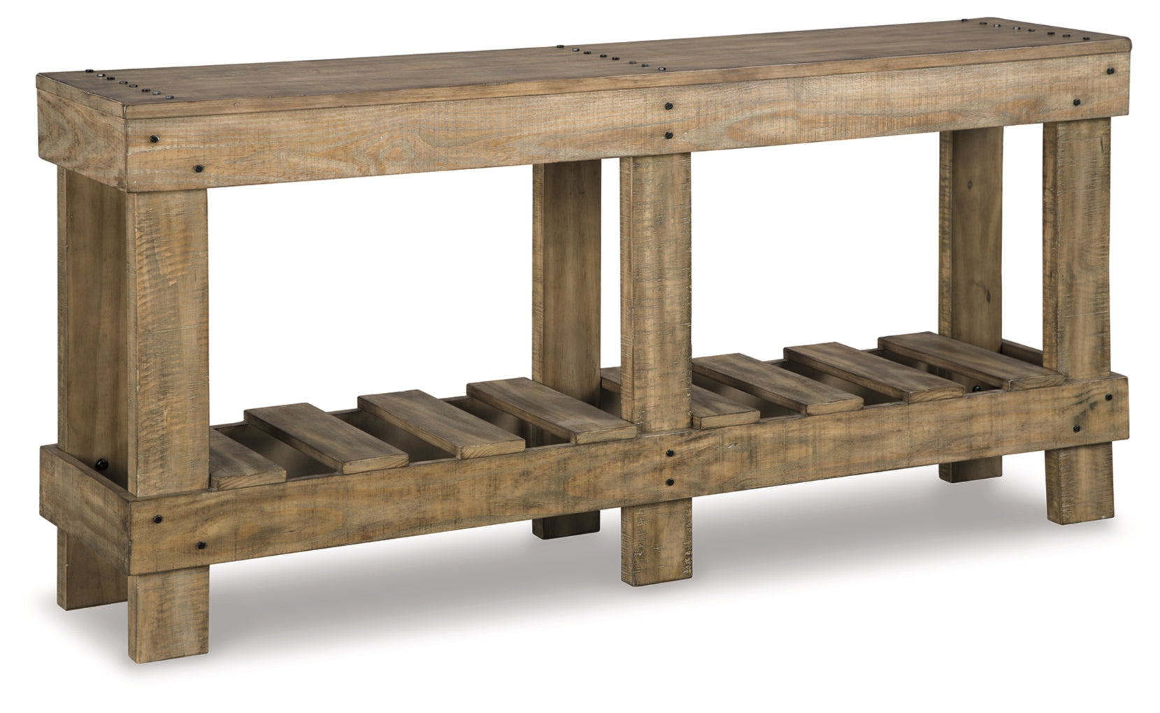 As this console table proves, sometimes less is more. Dramatically transform your living space with the warm and rustic appeal of solid wood construction and open-slat shelving. Washed in a light brown finish, this sofa table sets a new standard for down-to-earth refinement.