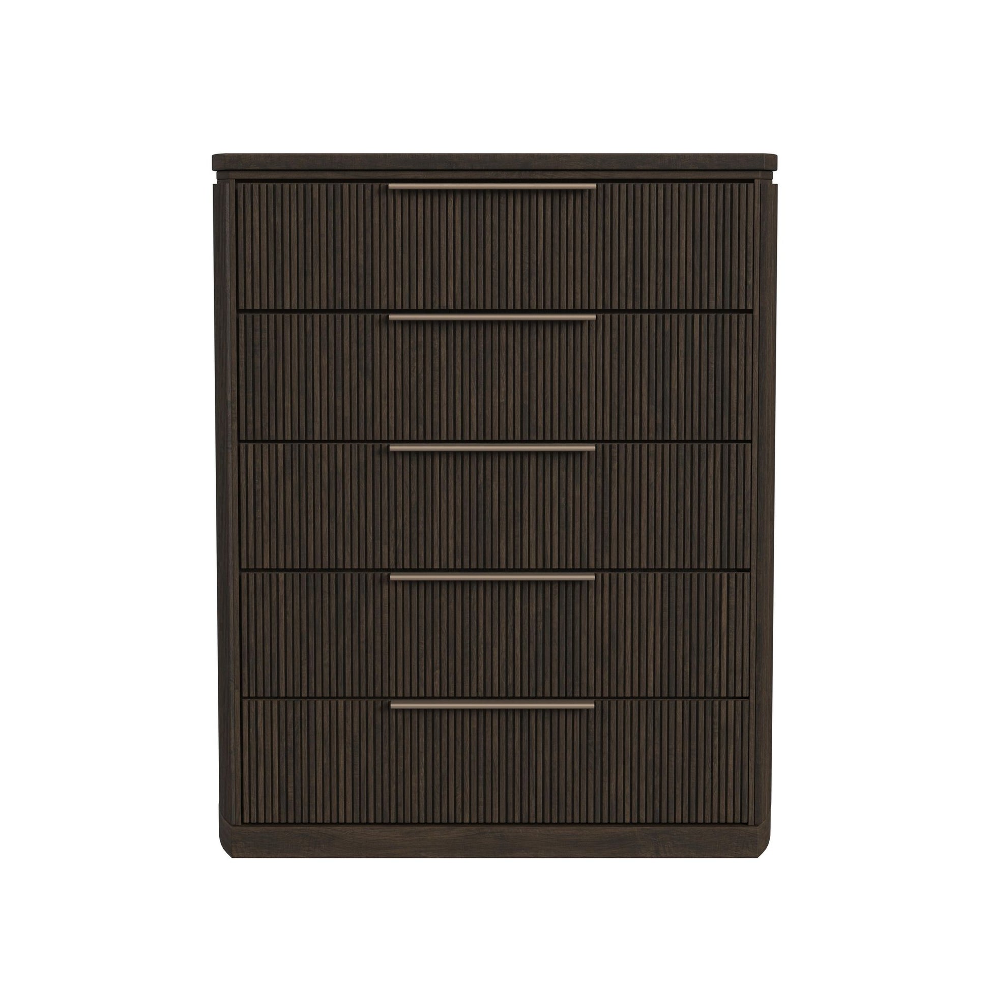 The Sylvie 5-Drawer Chest in Dark Brown is a uniquely refined addition to your bedroom. Outfitted with fine, decorative fluting and sleek, understated silver drawer pulls, the elegance of this piece is only matched by its quality construction. The spacious drawers feature smooth ball bearing glides, while the top drawer specifically is thoughtfully fitted with protective felt lining. For a piece that is as durable as it is elegant, the Sylvie 5-Drawer Chest in Dark Brown delivers in both quality and style.
