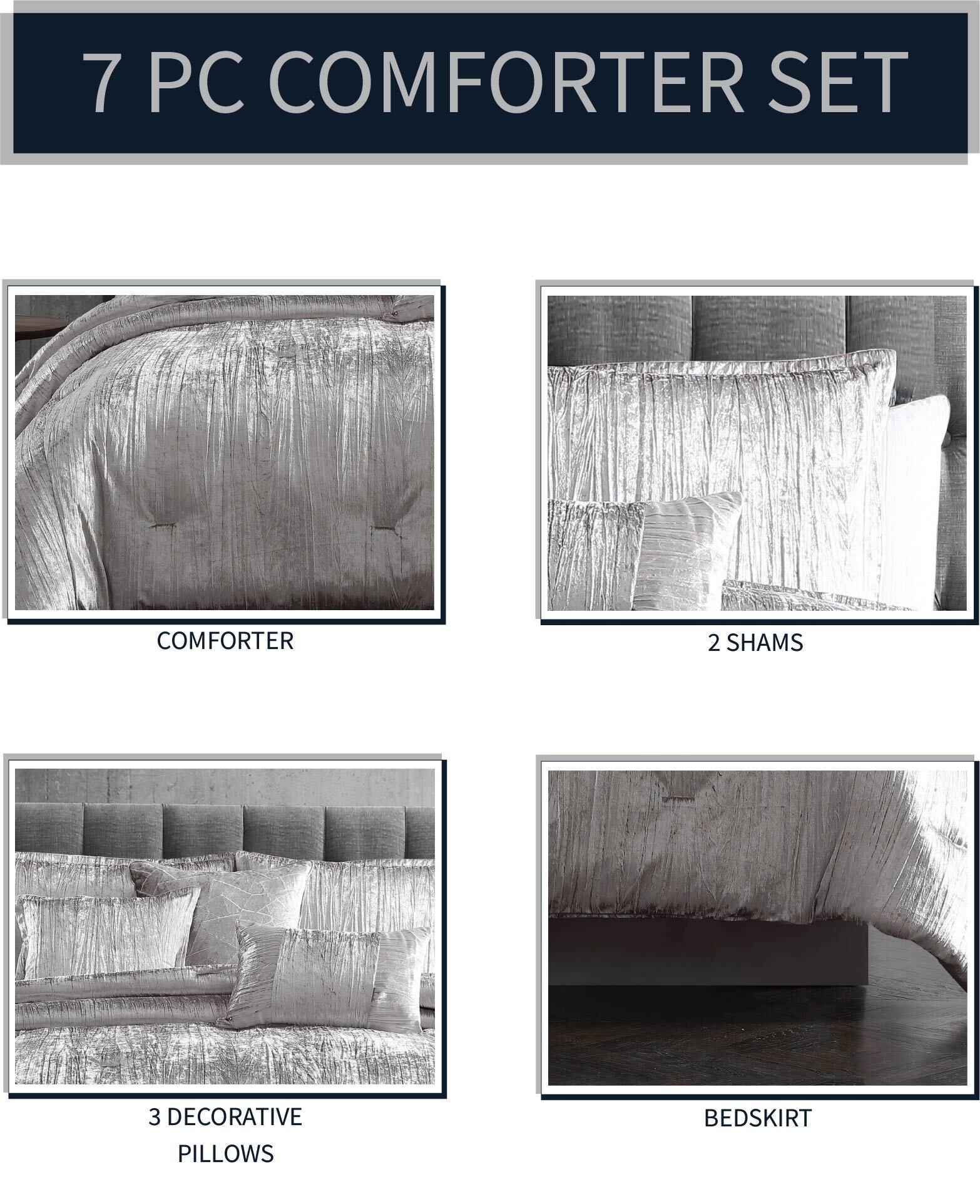 Elevate your bedroom with the Taos 7 pc Velvet Comforter Set in a stunning grey metallic velvet. This luxurious set combines softness and style, creating a cozy yet elegant atmosphere for restful nights and sophisticated decor.