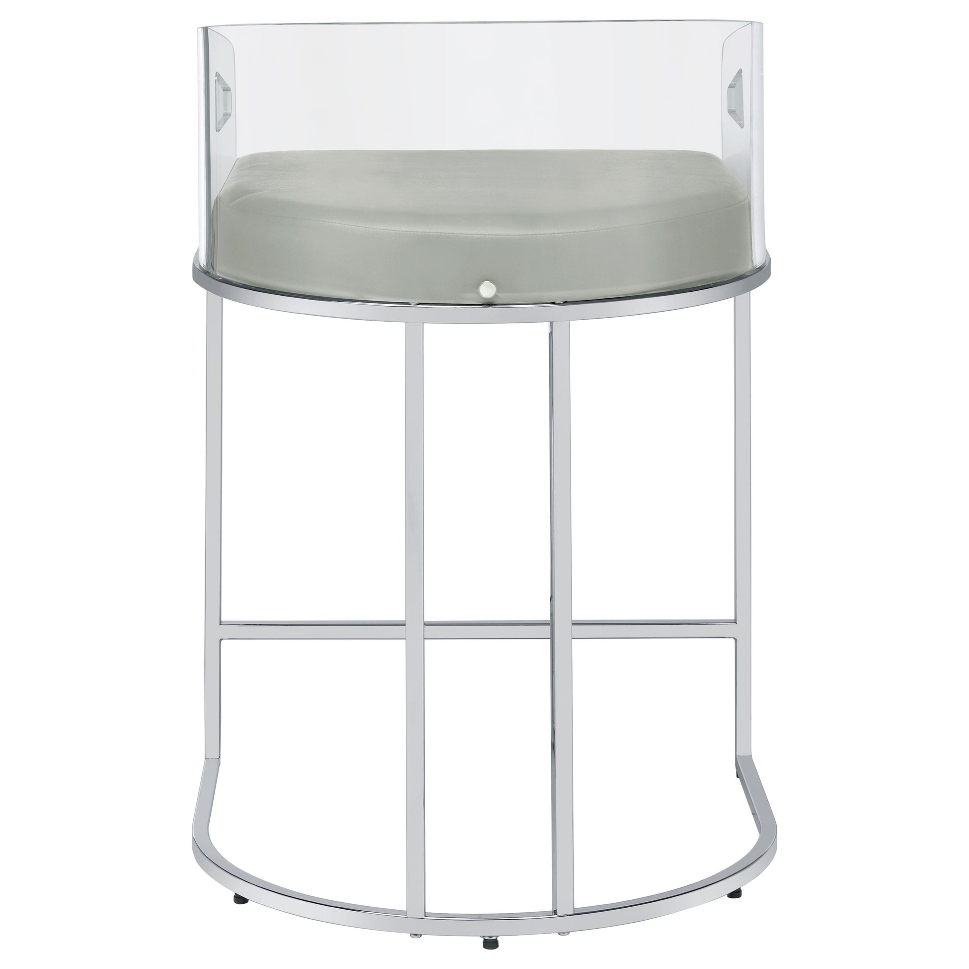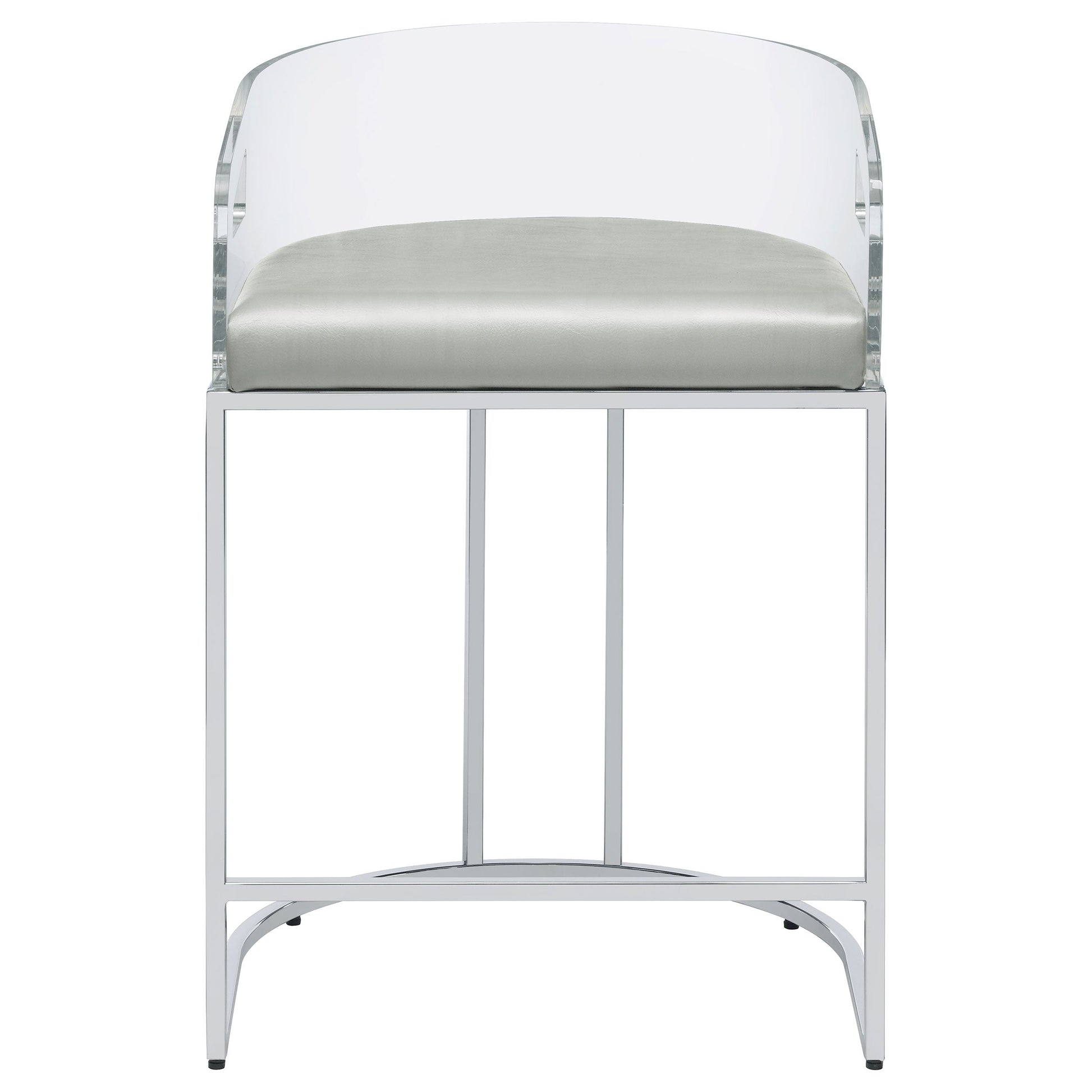 Ultra-modern with a retro-inspired vibe, this pair of stools make a striking piece to a dining room space. With a curved backrest in a clear acrylic material, each stool offers an open and airy design. Rest comfortably on a leatherette cushion as you dine or sip a cocktail. In addition, each stool is supported by a slim metal legs in a lustrous chrome finish and a base shape that mimics the rounded acrylic backrest. Pull up a pair of these stools to a kitchen bar or complete a compact home bar.