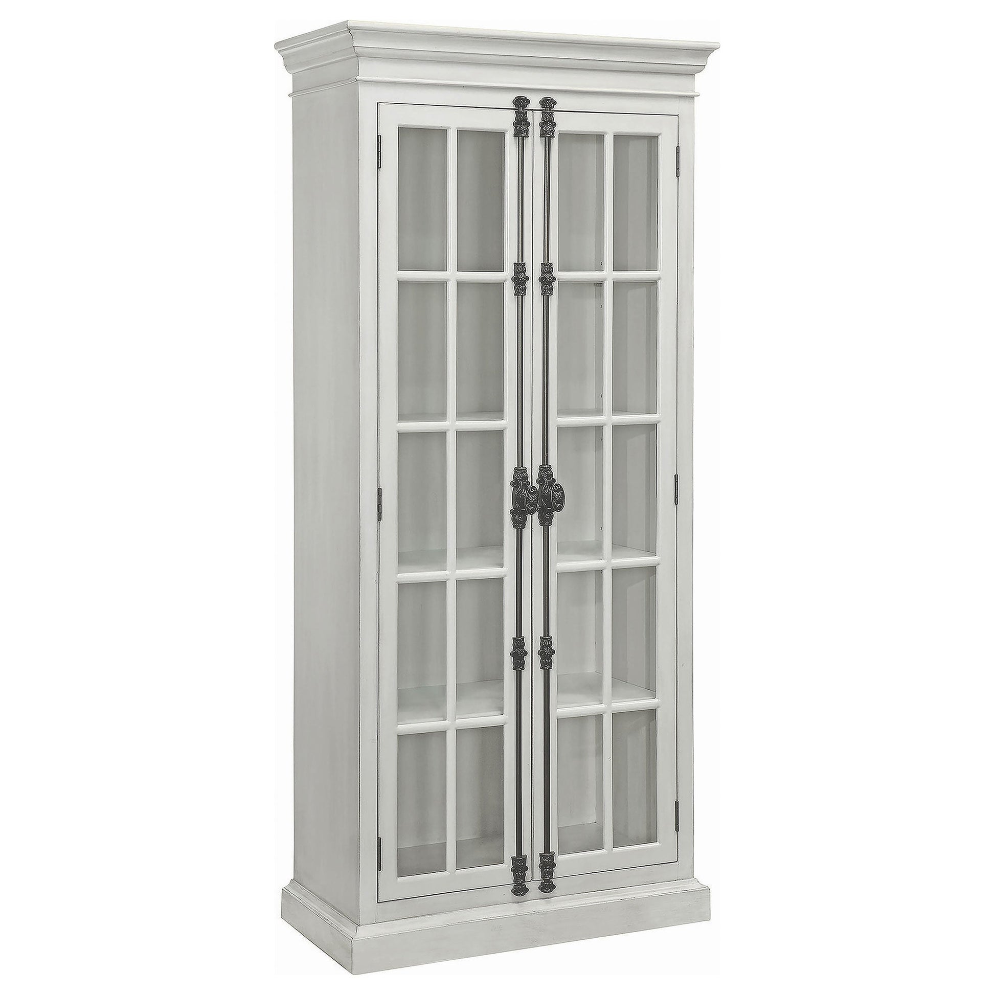 Envision a dining room graced by this tall dining cabinet, a vitrine that radiates charm with its distressed white finish, whispering tales of timeless elegance. Two glass doors unveil four shelves, ideal for displaying your cherished china. Adorned with antique French bolts and delicate molding, this dining storage piece transforms your space into a refined sanctuary, where every meal becomes a celebration of sophistication in your exquisite china cabinet.