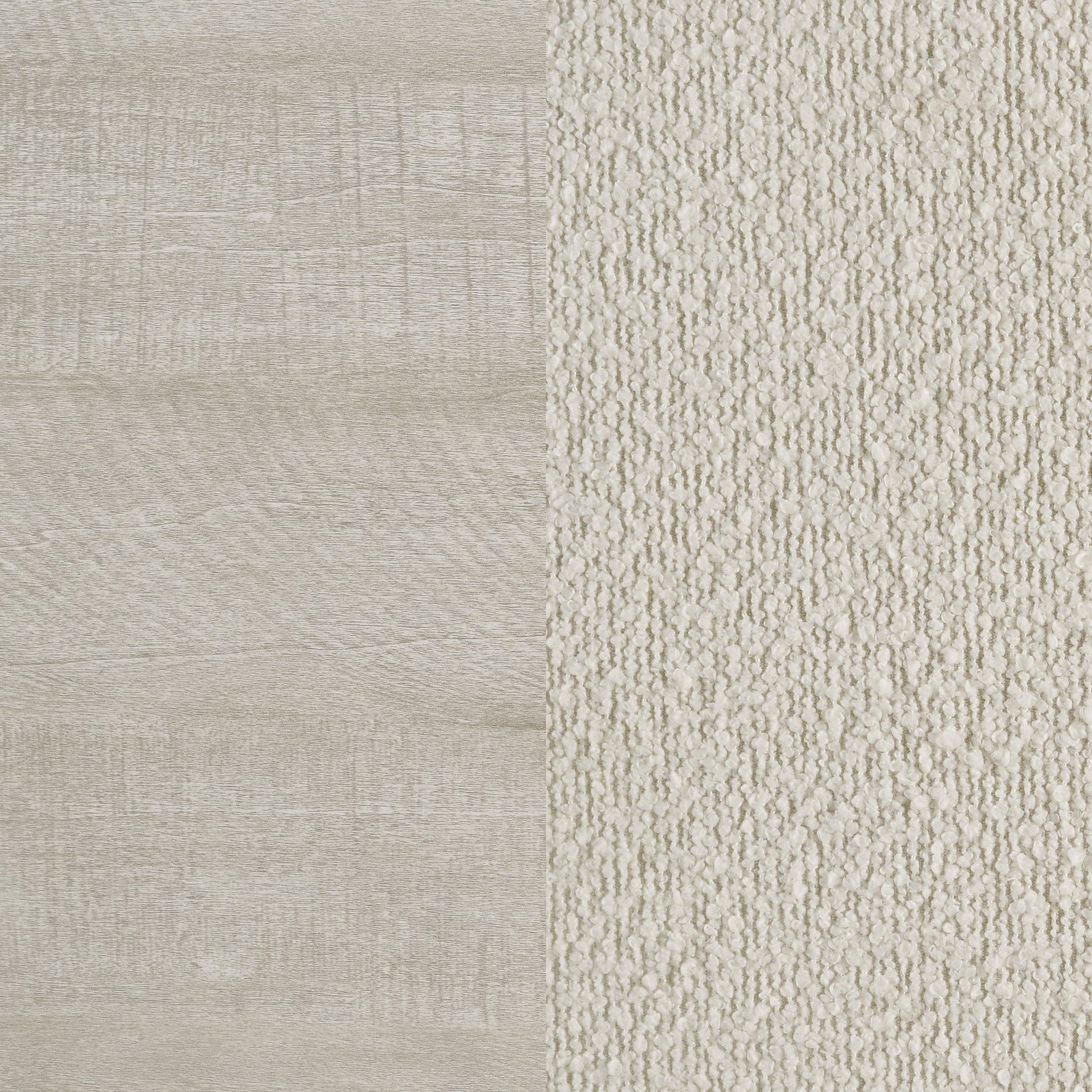 This contemporary bed is the perfect fusion of style and comfort, designed to bring a cool, modern vibe to any bedroom. With its unique "floating" effect, it creates a sense of spaciousness and sophistication. The headboard is upholstered in a soft, cream bouclé fabric, adding a touch of texture and warmth that complements the bed's rustic cream finish. Crafted from asian hardwood and engineered wood with a rough-sawn, white-washed engineered paper veneer, this bed showcases a Yin & Yang contrast between rustic and refined design elements.