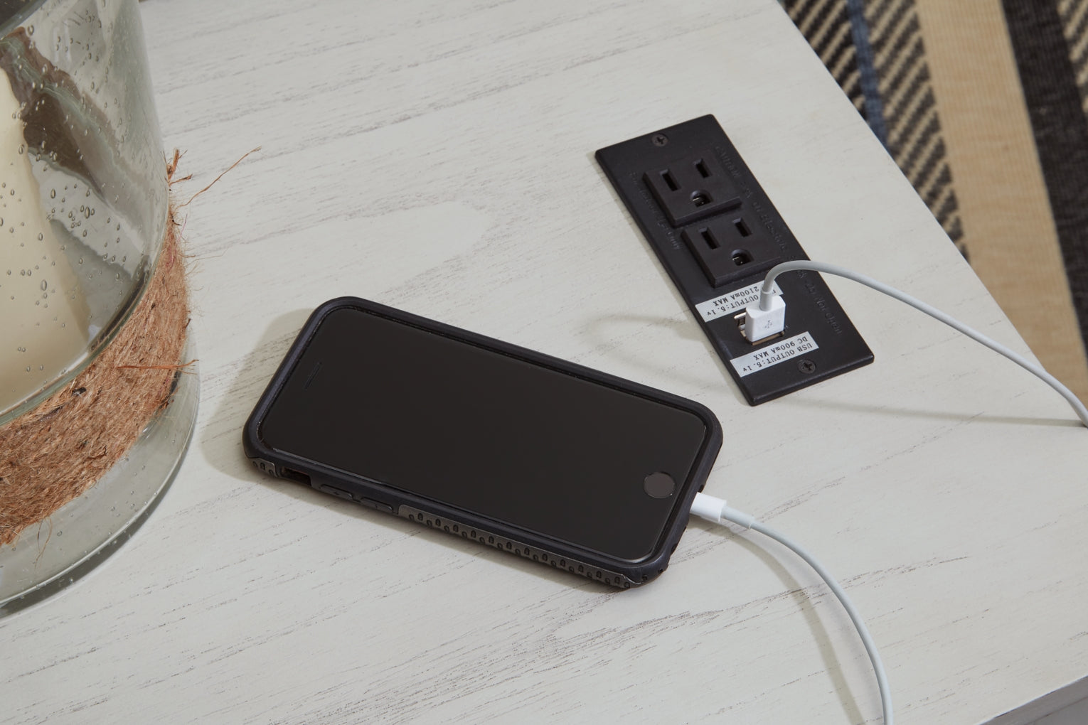 Add big character to a small space with this chairside end table. With its compact size and strong silhouette, it can go anywhere and blend easily into the decor. Less is so much more with the Shaker-inspired design and whitewashed wood grain finish. Loaded with form and function, this end table displays accent pieces and stores essentials securely while keeping devices powered up.