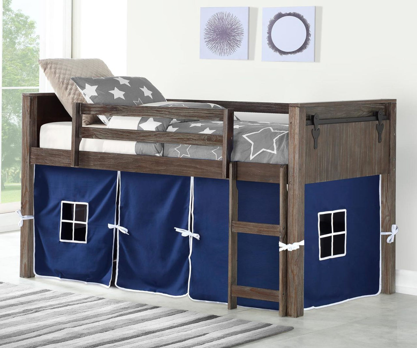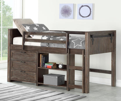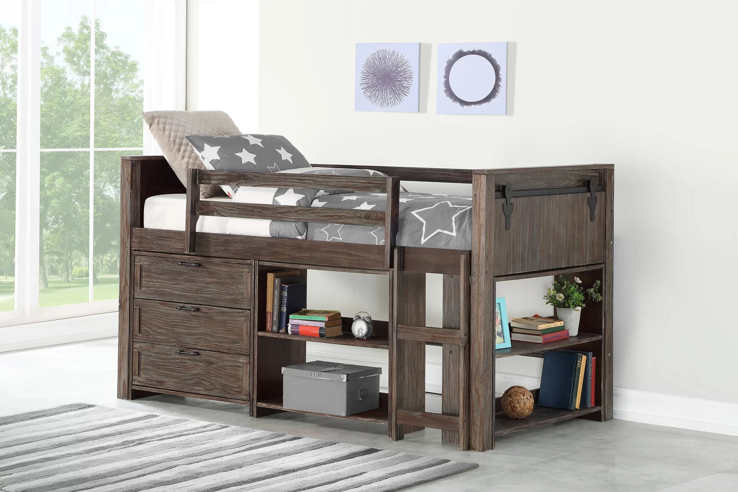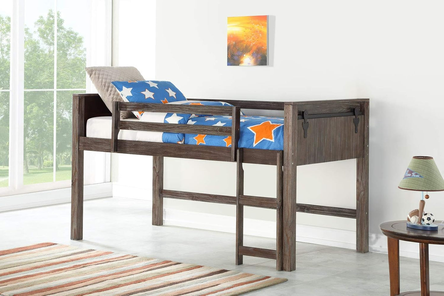 Introducing the Donco Kids Low Loft Bed in Brushed Shadow Finish, crafted with enduring love, this low loft bed transcends ordinary sleep spaces. Solid wood construction guarantees unwavering strength, ensuring your child's safety as they embark on thrilling adventures above. A brushed shadow finish bestows an air of timeless elegance, seamlessly complementing any room décor.
