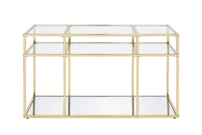 Modern simplicity makes your space feel uncluttered and stylish. The Uchenna Sofa Table has a brilliant color and lustrous finish to enhance it's sleek modern silhouette. Metal table frame in a gold finish exudes lustrous shine, topped with tempered glass to bring a glamorous-yet-modern flair to this piece. The Uchenna Sofa Table really makes a style statement. Shape up your space with this voguish accessory.