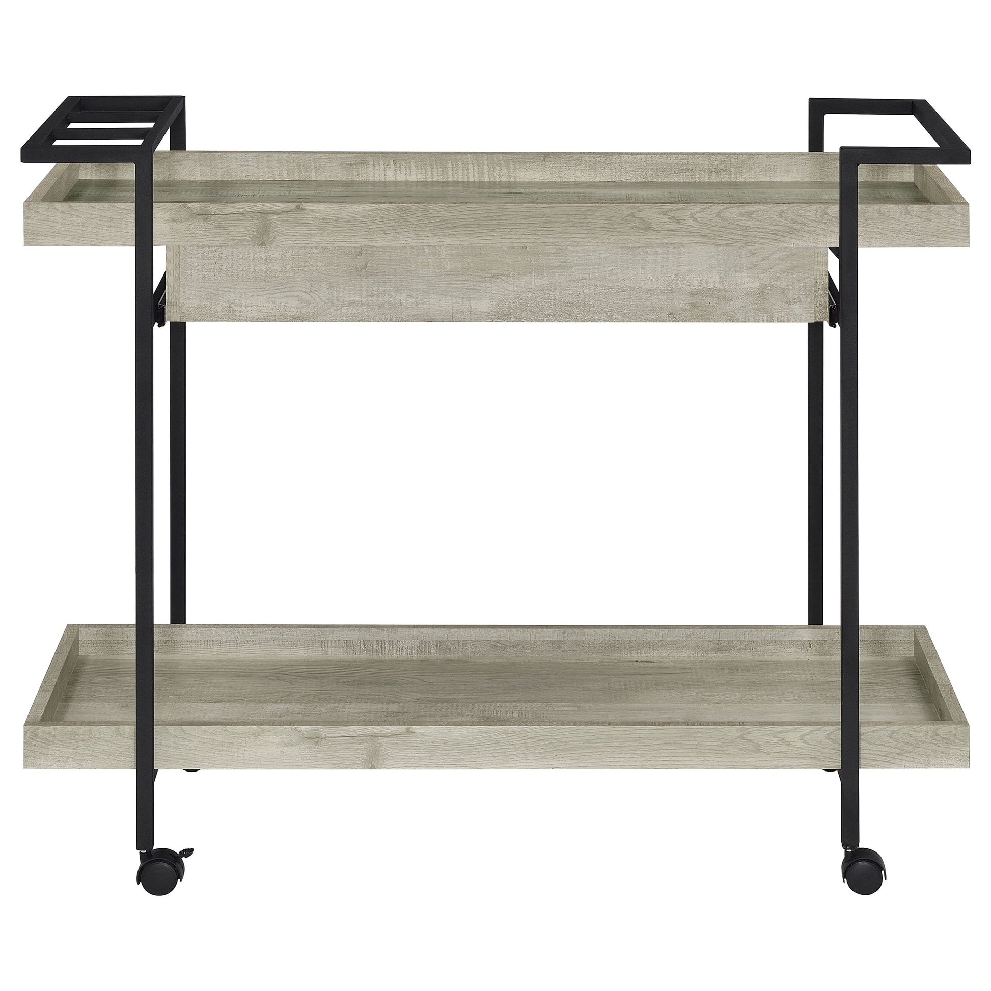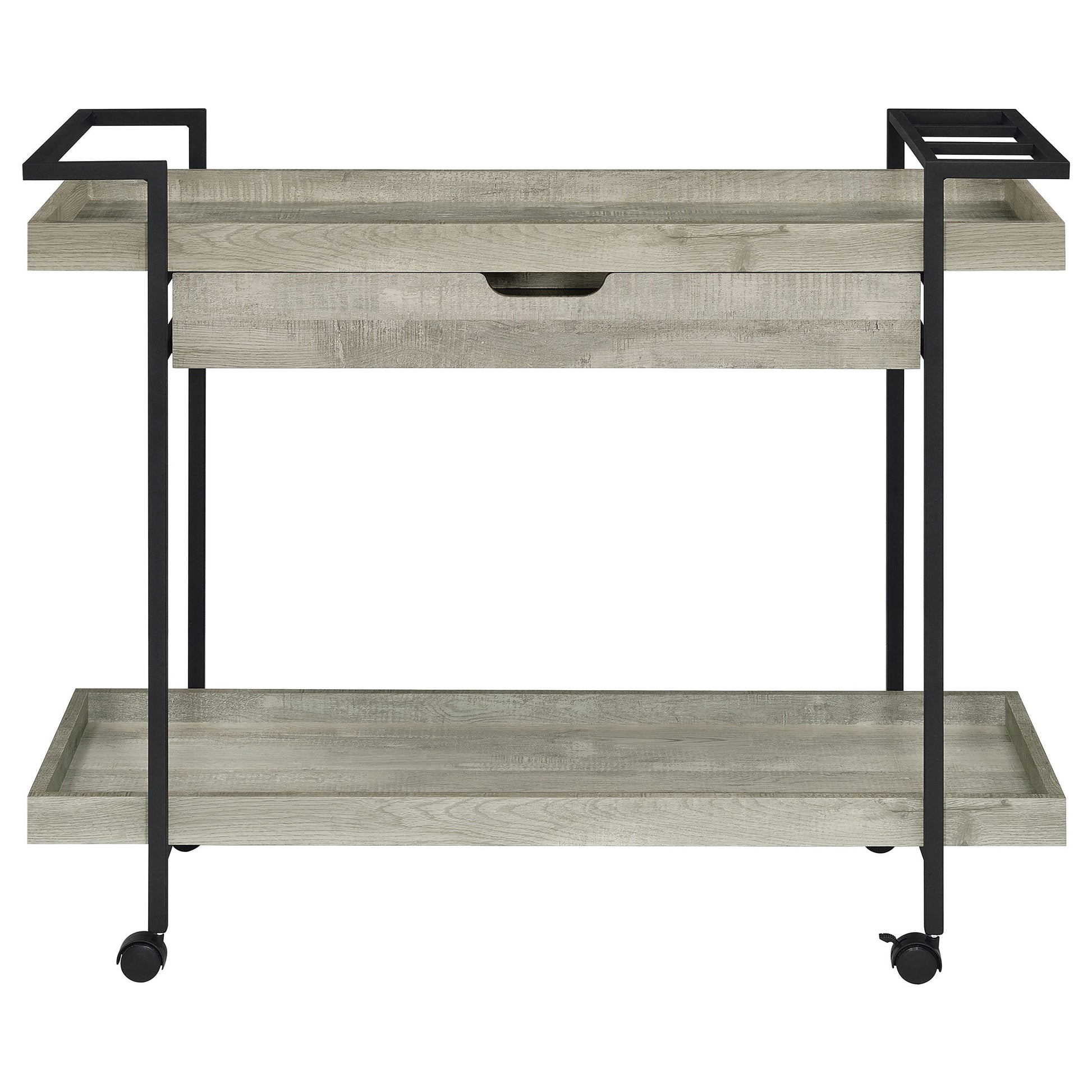 Speakeasy charm meets modern farmhouse in a delightful mobile bar cart. Whether you're mixing cocktails or pouring a favorite vintage, the cart offers plenty of space for both storage and prep with a tray-style top and shelf, plus a drawer ideal for accessories. A black finish metal frame includes handles, with three open squares on one side that help to keep bottles upright. A casual gray wood grain finish accents the look with farmhouse inspirations, perfect for relaxed living and dining rooms. Ball bearing drawer glides and caster wheels complete the cart with smooth, seamless performance.