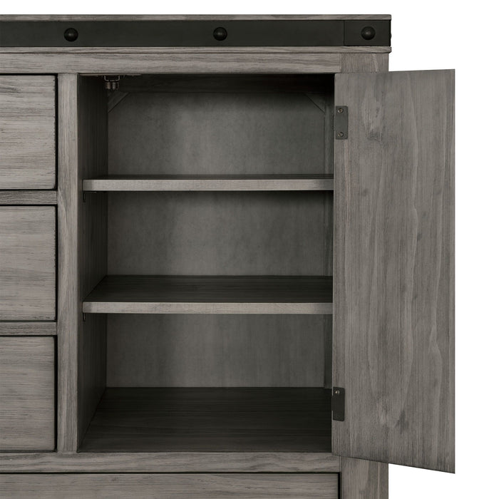 The Wade 5-Drawer Gentlemans Chest is the ultimate chest for your bedroom! This chest comes with five, spacious drawers; perfect for easily keeping all of your belongings neatly stored away. This piece also comes with a cabinet with interior shelves for extra storage space. The bottom drawer features a dust proofing layer to help protect your belongings. The drawer pulls and trim along the top of the chest are both metal with a black finish. Along the trim on the chest are decorative bolts, adding a little extra flair. Please note wood grains vary piece by piece and will not look exactly like the picture.