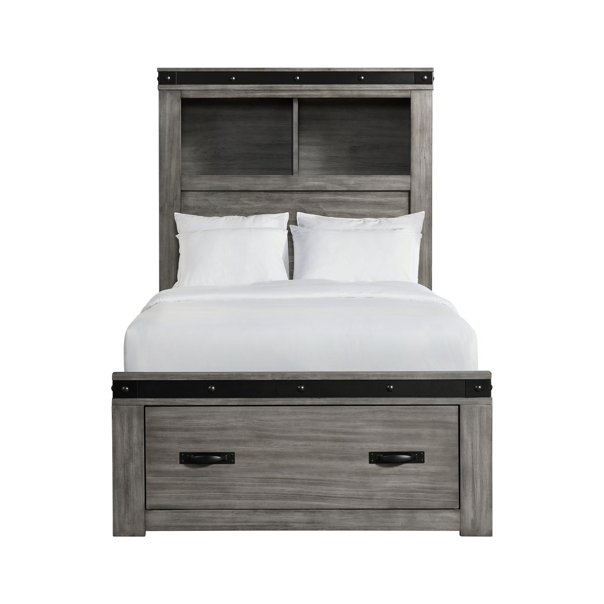 The Wade Youth Twin Platform Storage Bed will be a perfect fit for your kiddo! This bed offers plenty of storage options, itll be easy to keep clothes and toys out of sight. The footboard comes with two, spacious drawers; while the side rails each have a drawer too. Thats not all of the storage, the headboard comes with shelves so you can easily store your favorite bed time reads. The bed is dresses in a transitional gray finish, with black metal trim along the fronts of the headboard and footboard. Black, powder coated metal drawer pulls complete the look of this youth bed, that your kiddo is going to enjoy for years to come!