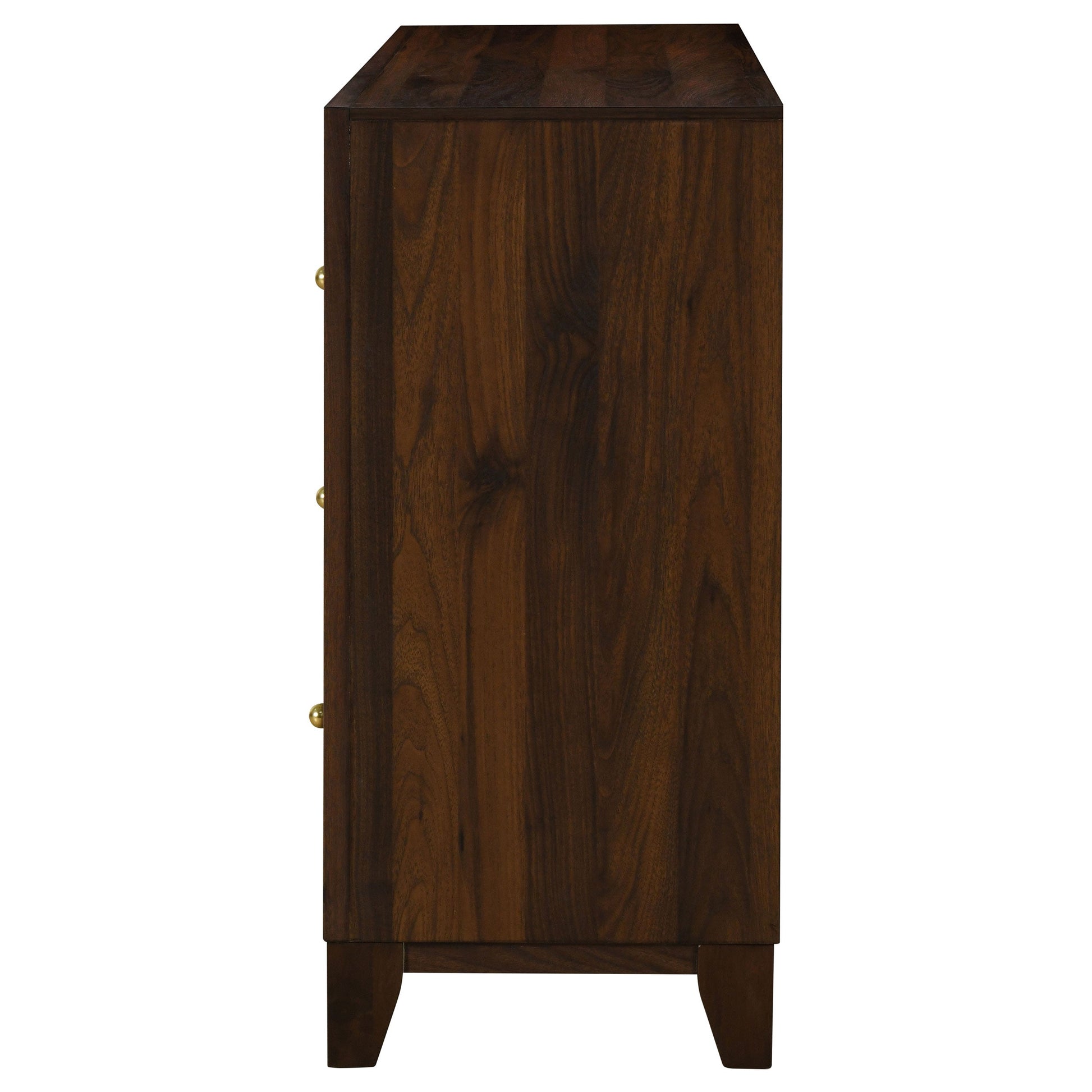 Complement your refined bedroom space with the abundant storage featured in this modern six-drawer dresser with a mirror. A rich walnut wood finish complements engineered wood construction and laminate construction, delivering excellent durability and longevity. Drawer fronts are dotted with gold finish round knobs, adding the perfect dose of warmth and glam contrast. Mitered trim and angular tapered block legs complete the look with a hint of precision and structure. The framed mirror on top adds lightness and reflectivity.