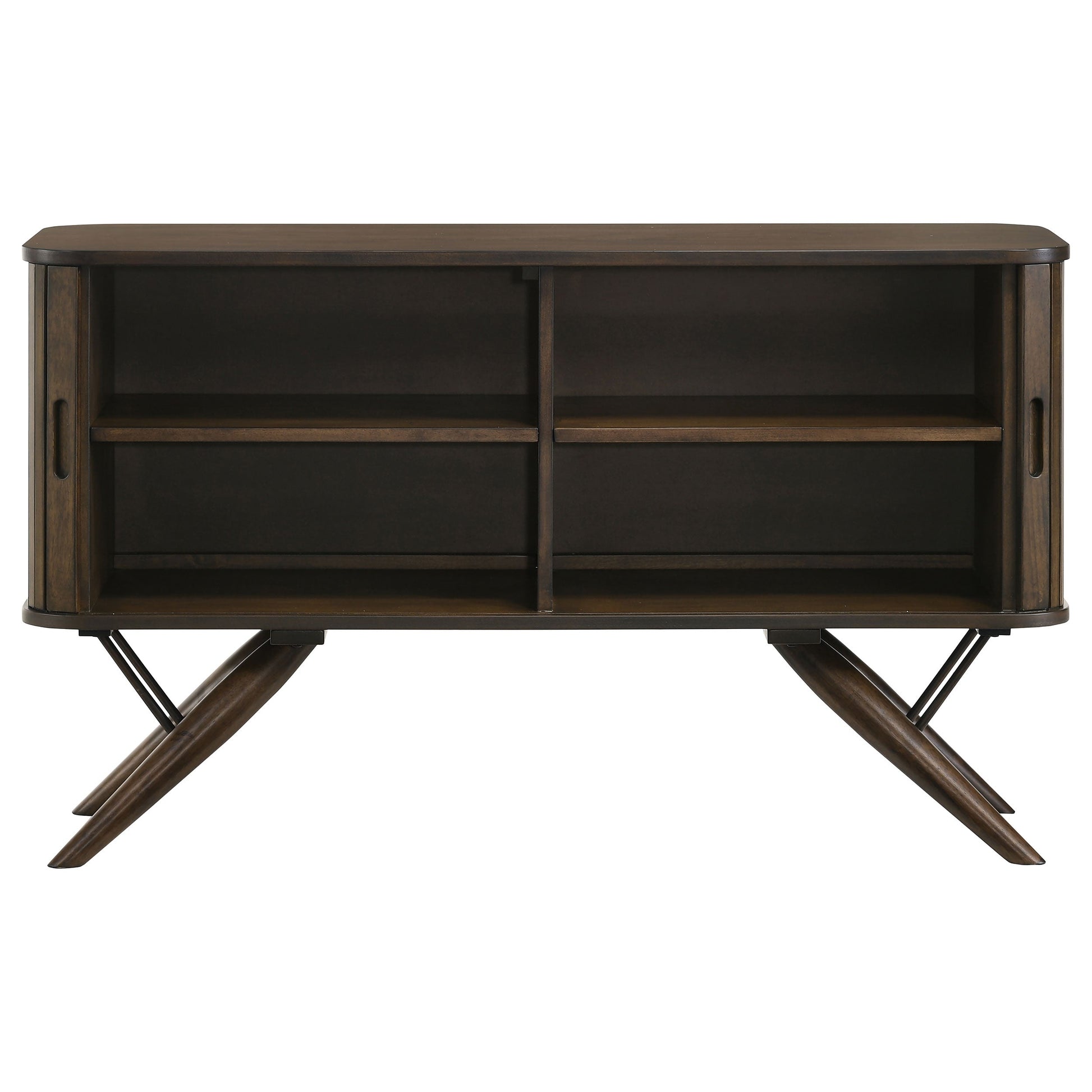 Elevate your dining area with this mid-century modern server. Beautifully designed with campaign style influences, this contemporary server rests on striking flared legs that offer a retro-inspired aesthetic. Tambour doors with finger-tip pulls bring out a nautical expression and a vintage touch. Open the cabinet doors and you will find ample space for all your dishes, stemware, and more. A rich, dark walnut finish brings out charming details.