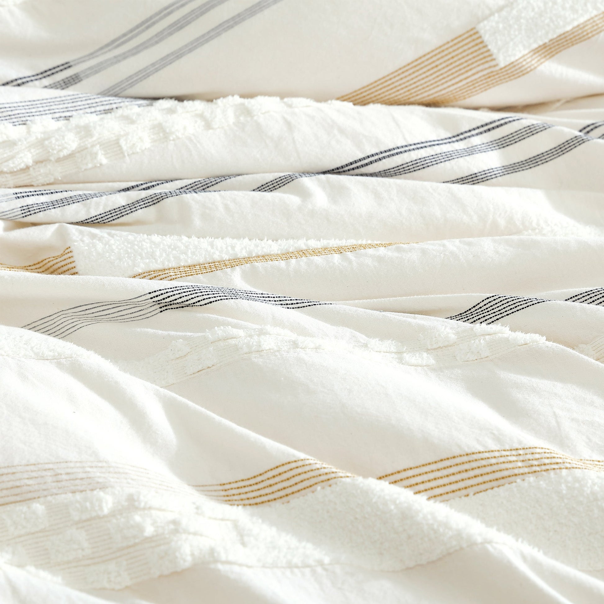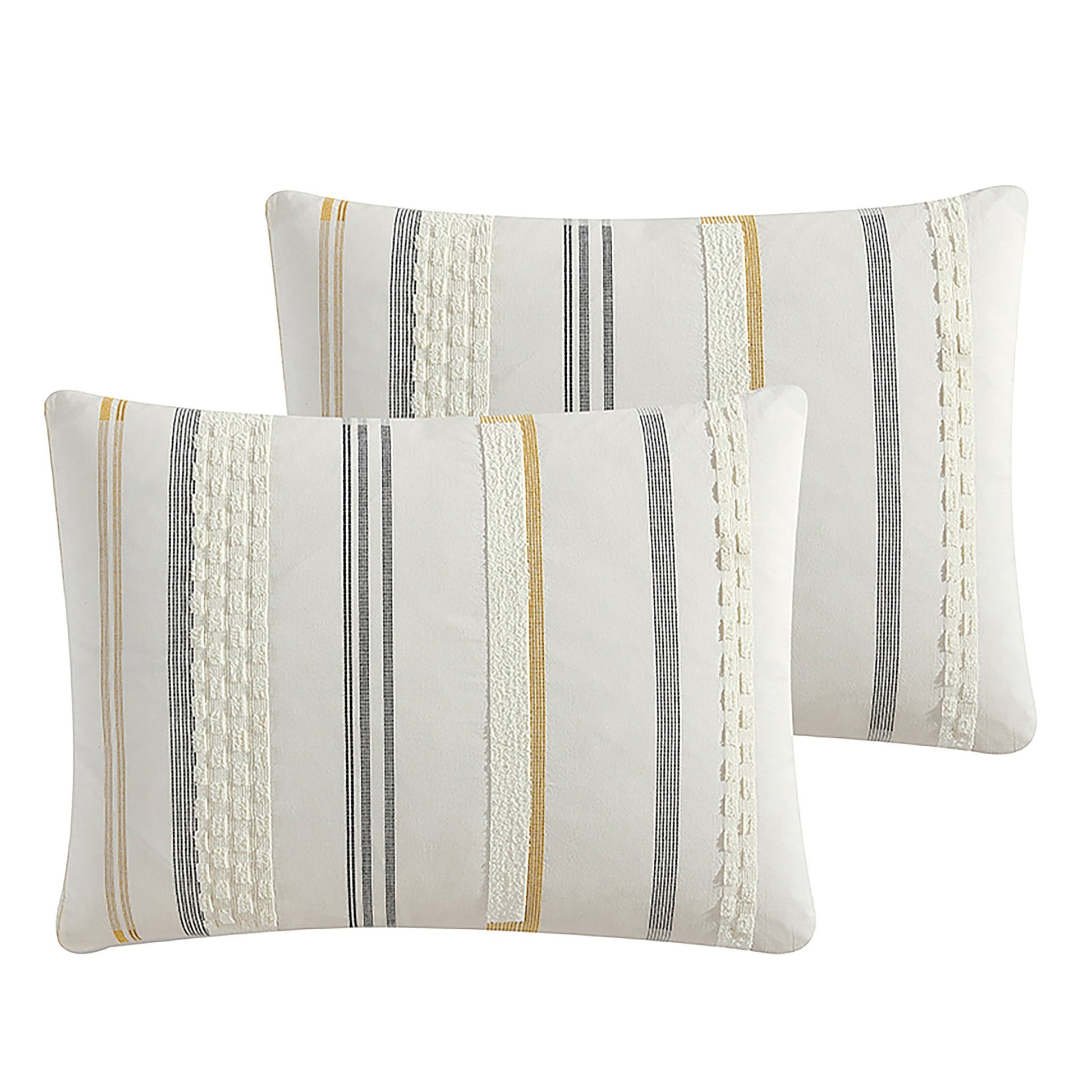 The Wilkinson 5 pc Comforter Set features a crisp white base accented with stylish yellow and grey stripes, adding a fresh and modern touch to your bedroom. This set combines comfort and design to create a cozy, inviting atmosphere you'll love.