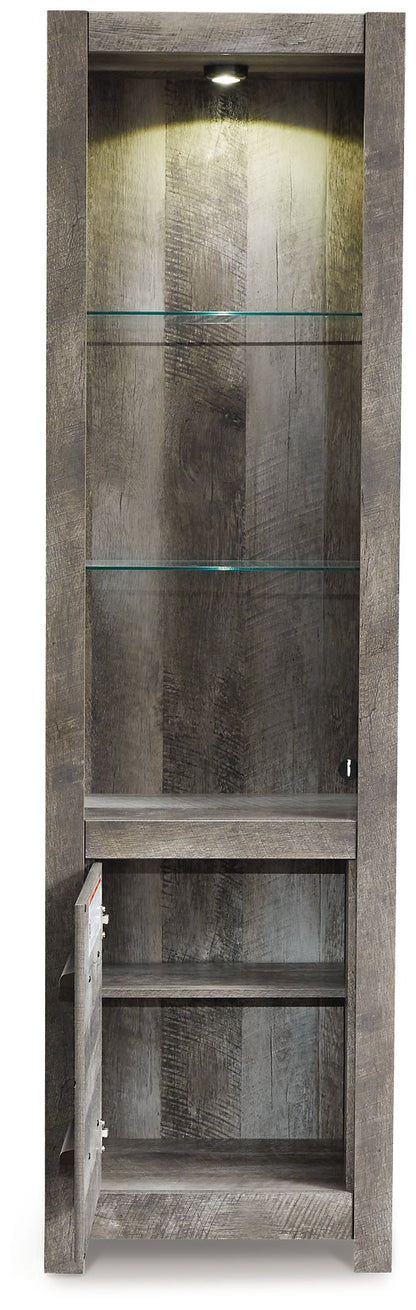 - Each pier with 2 glass shelves and cabinet door revealing single-shelf storage; overhead LED lighting; reversible cabinet doors and can open left or right with consumer assembly modification