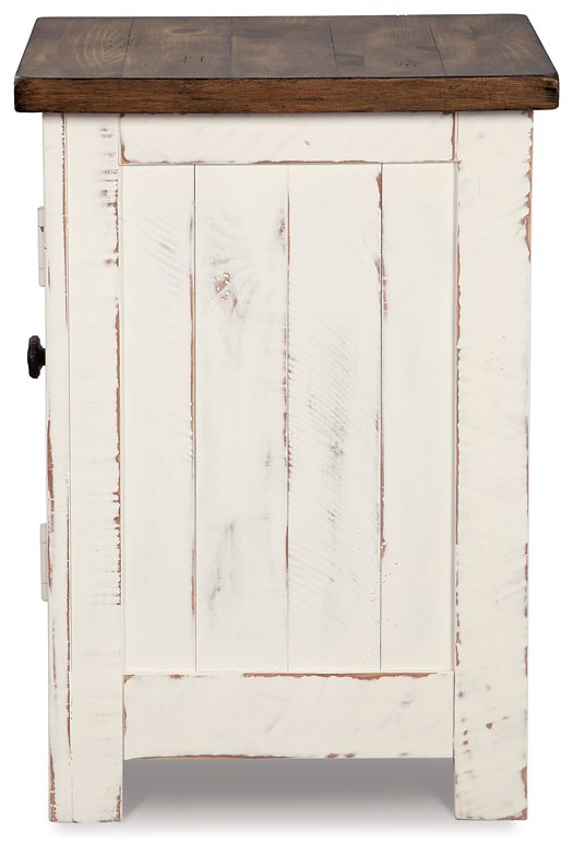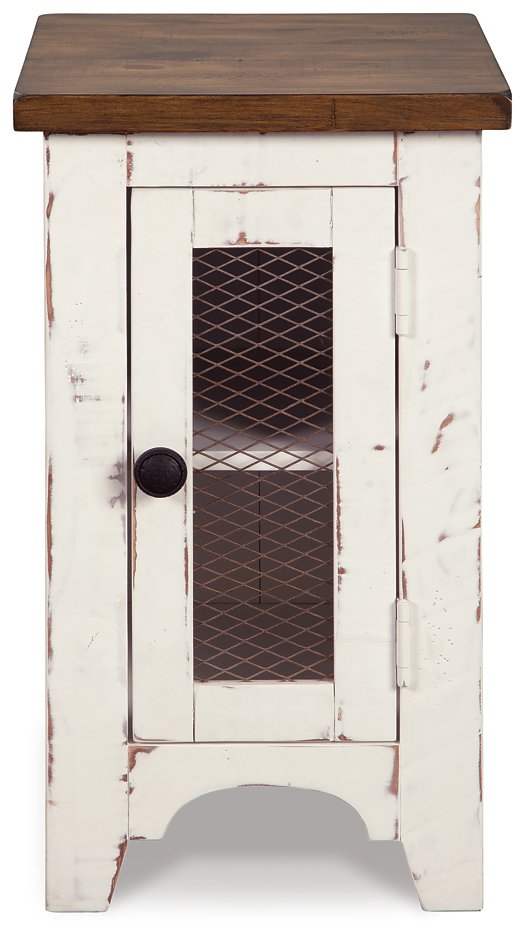 Double take. Sporting a two-tone finish that pairs a distressed vintage white with aged natural pine color, this chairside end table elevates the art of rustic farmhouse living. Enhancing its charm: shelved storage visible through the cabinet door with inset metal grill.| Full Dimension | 14W x 17D x 25H |