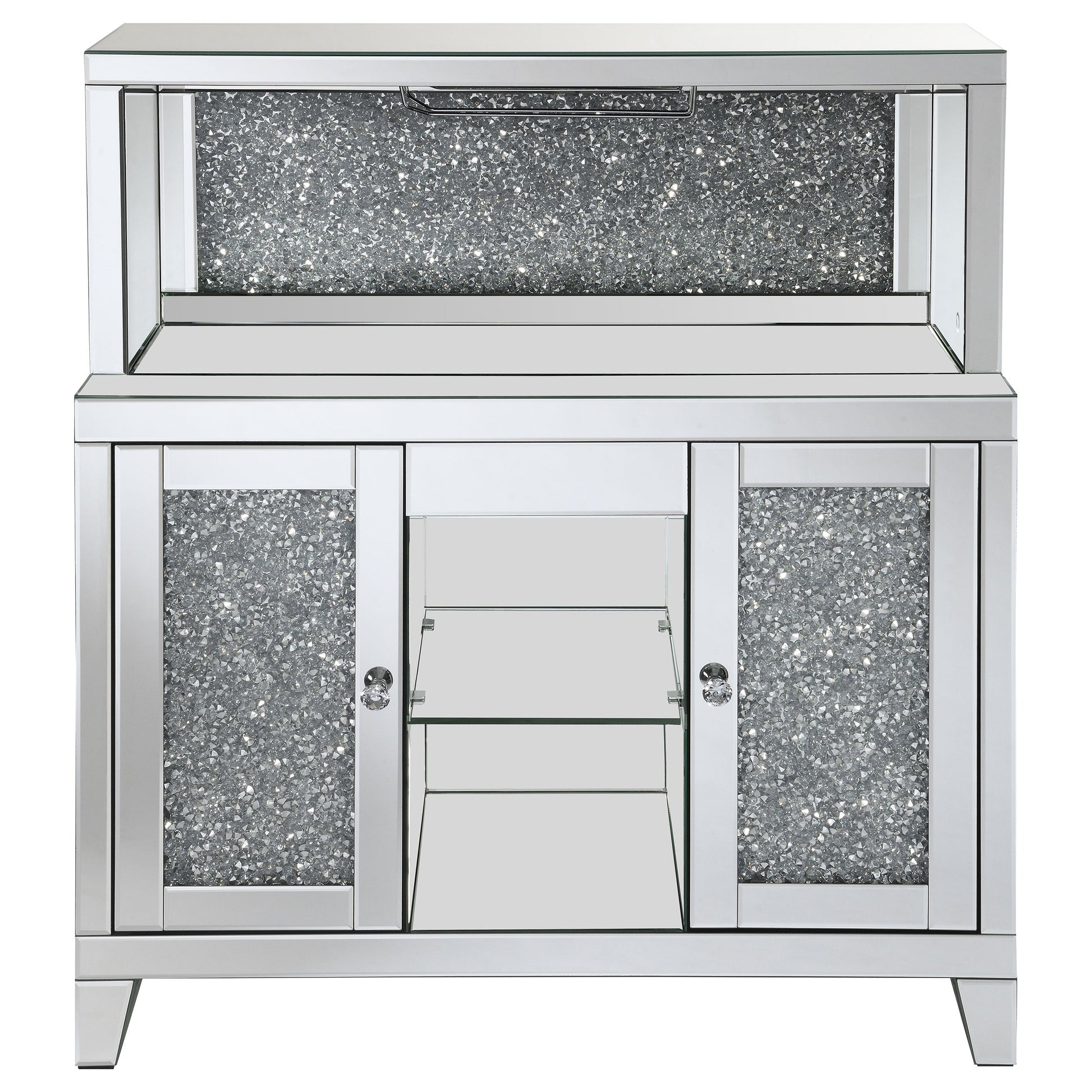 The combination of the reflective surface, faux diamonds, and crystal knobs create a luxurious and eye-catching piece