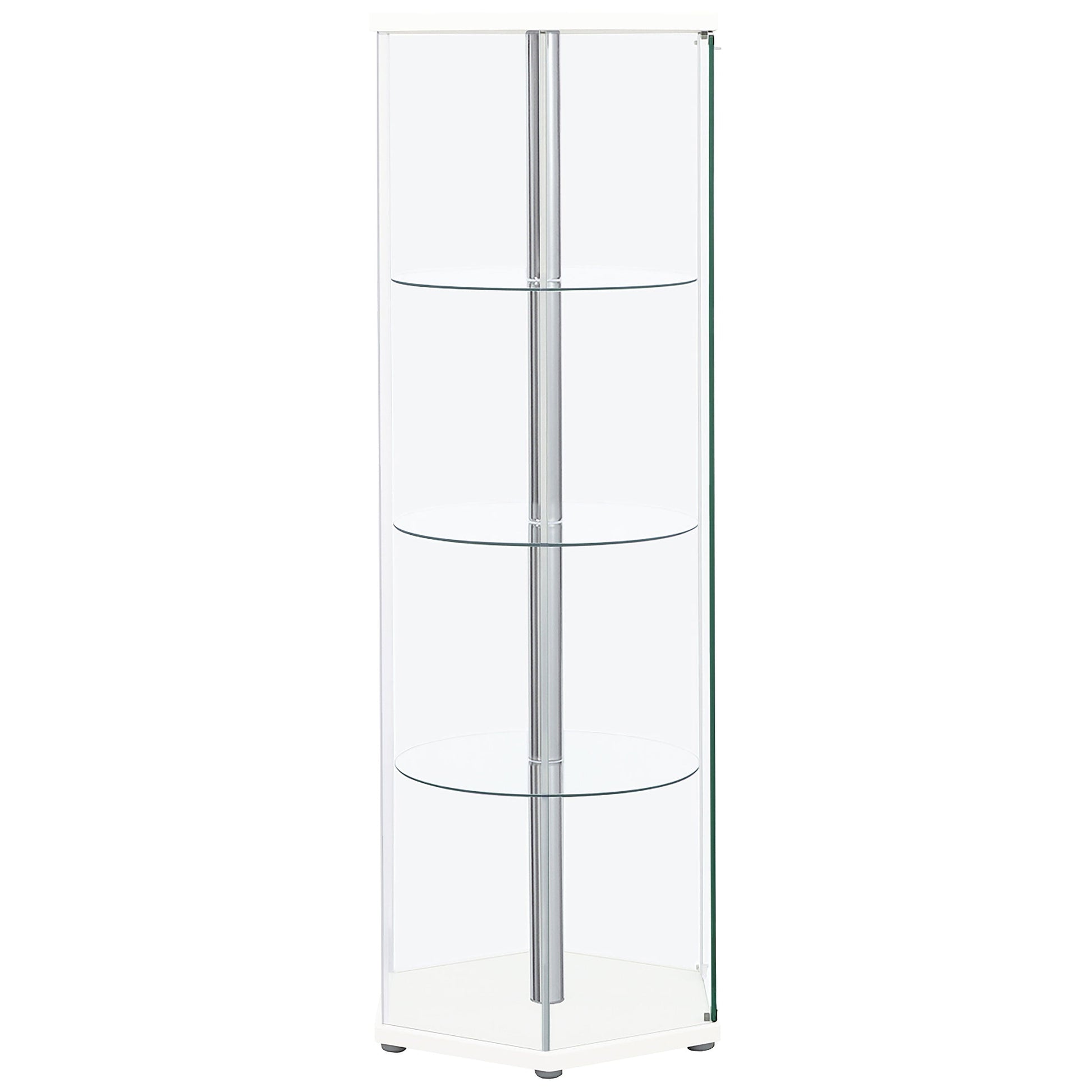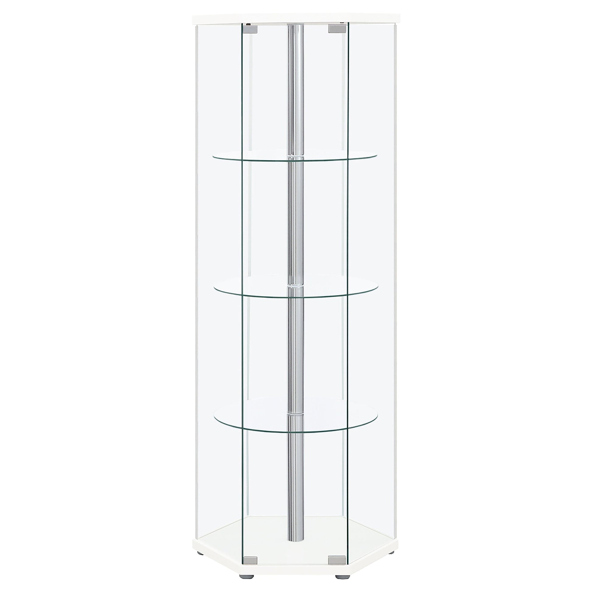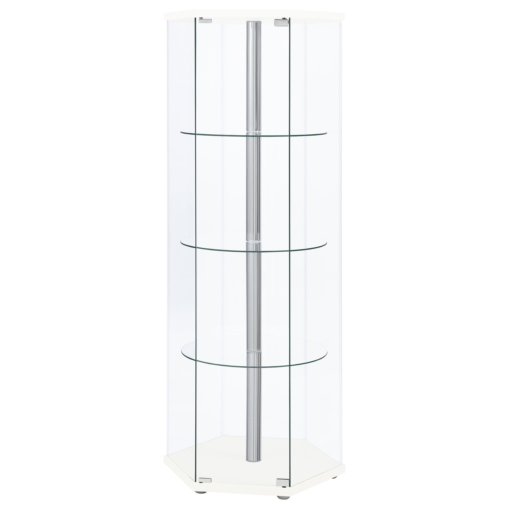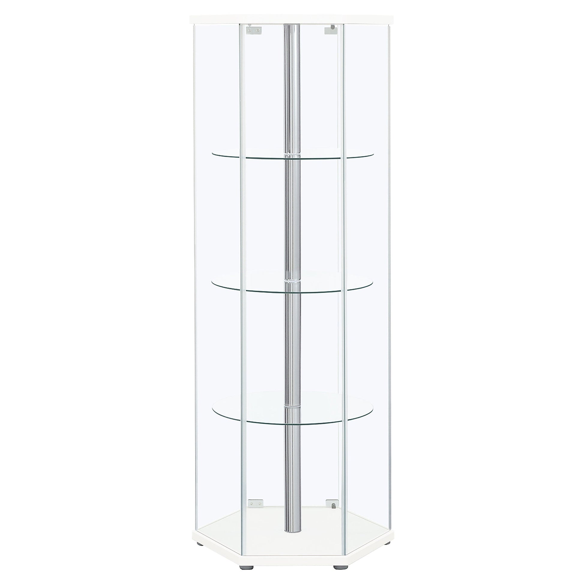 Explore the cutting edge properties of geometric design. Made from glass, this curio cabinet wakes up a contemporary space and puts a new spin on an old classic. Hexagonal in shape, it features a cool center pole for visual effect. A black finish top and base provide superb contrast. Display favorite decor on a trio of round glass shelves.